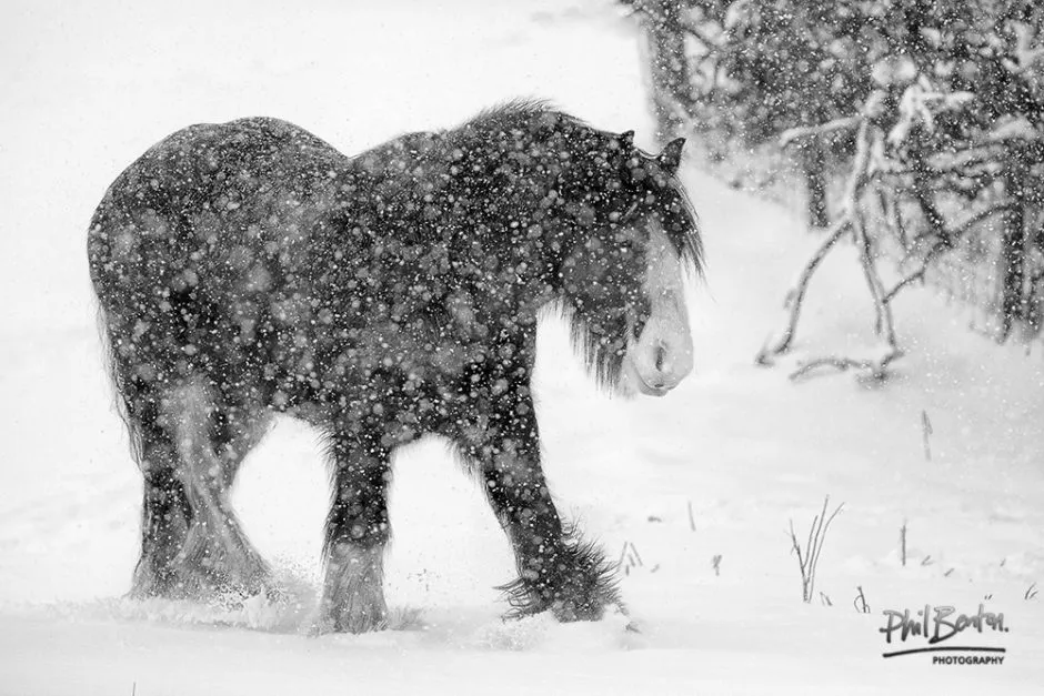 A high quality A4 print of a Shire Horse heading for shelter in a snow storm