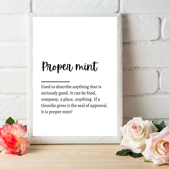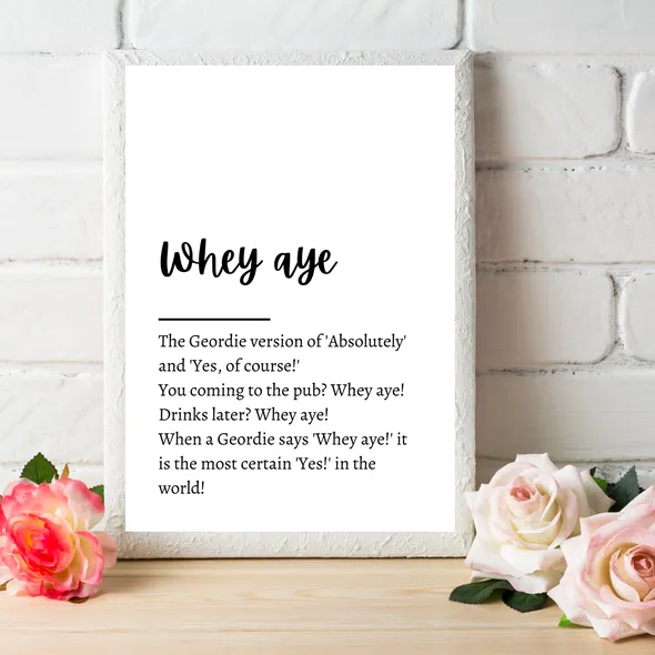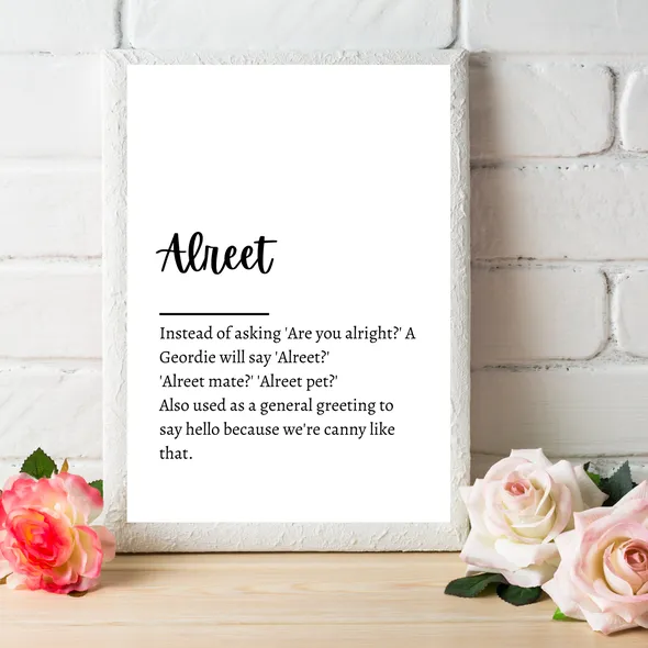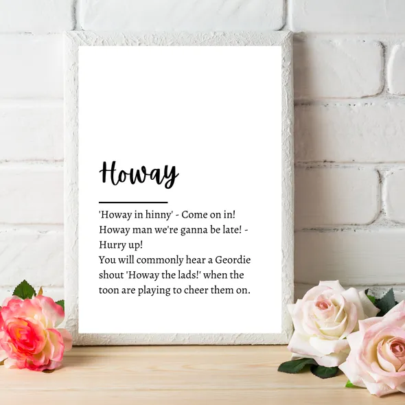 A collection of popular Geordie words and their meanings. A perfect gift for a Geordie!You will receive a quality unframed print, which is printed onto A4 white textured 255gsm cardstock.Your print will be placed inside a cellophane sleeve to keep it protected, and then posted to you in a board back envelope.Is your order a gift for someone? I can add a gift note free of charge. Simply let me know what you would like to say in the 'note to seller' option when you place your order. Gift notes are printed onto brown kraft mini cards, and I will hand write your message inside.I am always happy to work on a custom order, so if you can't find exactly what you're looking for, I am more than happy to discuss a custom order with you!You can find me on:Facebook www.facebook.com/flossyfloopsInstagram: www.instagram.com/flossyfloopsWhile you're here... why not take a look around the other sections in my shop. I have a selection of prints and handmade gifts suitable for all occasions!www.flossyfloops.etsy.comThanks :)