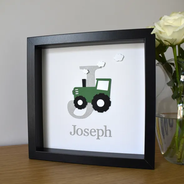 Children’s Personalised Initial Tractor Frame Features a green tractor mounted onto the initial and backing paper with foam pads to give it a raised effect. Also includes a child’s name first name. You can choose the colour of the initial and name as well as the tractor colour too. If you want other words please get in touch. Frame colour options are white, black and oak effect. There is no glass in the frame, it is a Perspex sheet for safety reasons. DUE TO BEING HANDMADE PLEASE ALLOW UP TO 2 WEEKS FOR DISPATCH. PERSONALISED ITEMS ARE NON-RETURNABLE/REFUNDABLE. Find me on Facebook, Instagram and Pinterest too. I can do many other different designs and colours with any wording you wish. Please get in touch if you would like to know more or have a specific design request. Thanks for looking! Love & Wishes from Elara Enchanted x