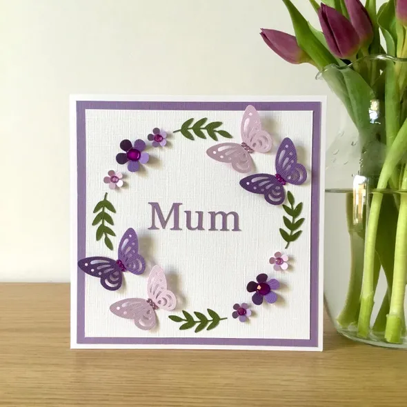 A simply beautiful butterfly and flower card for a loved one that will suit many different occasions such as birthdays, get well soon, anniversary, and thinking of you.Three different shades of the colour of your choice, hand punched flowers and butterflies with added matching coloured gems and the word of your choice in the middle, e.g. Mam/Mum/Gran/Nan/Louise/70.The card is blank inside for your own message but I can write a message for you and send the card direct to the recipient.Size: 7x7 inches, 300gsm card.Supplied with a white 100gsm envelopePERSONALISED ITEMS ARE NON-RETURNABLE/REFUNDABLE.I can do many other different designs and colours with any wording you wish. Please get in touch if you would like to know more or have a specific design request.Find me on Facebook and Instagram to follow my journey and see more of my work.Thanks for looking!Love & Wishes from Elara Enchanted x