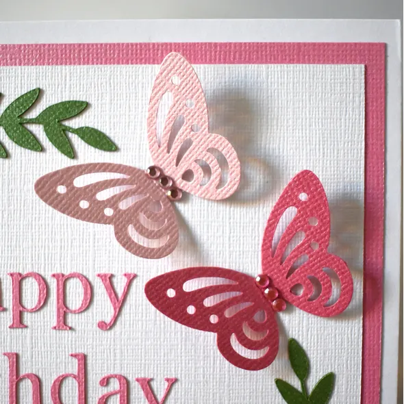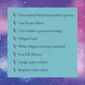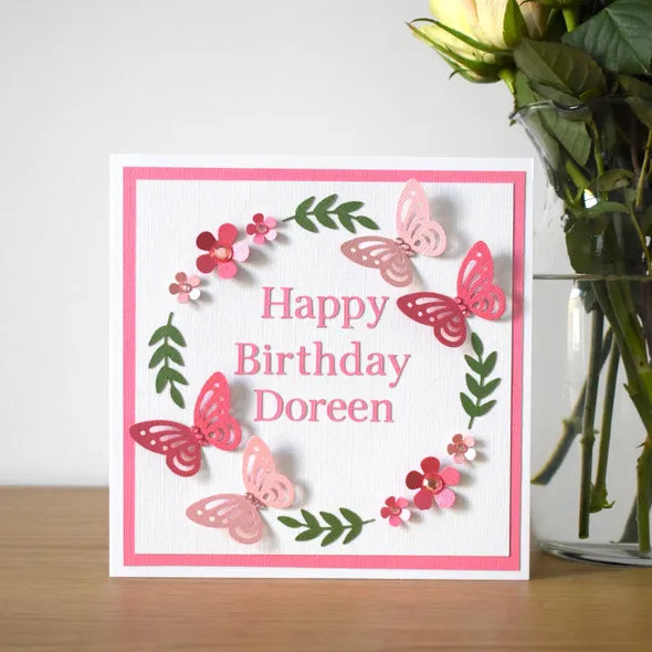 This flower and butterfly personalised birthday card is made up of hand punched butterflies and flowers in the colour of your choice with added gems for a gorgeous sparkle. It would make the perfect Mum birthday card.Arranged into a circle shape around the THREE words of your choice in the middle, e.g. Happy Birthday Nan, Get Well Soon, Thinking of You, Fabulous at 50. A simply beautiful greetings card for a loved one that would suit many different occasions such as thank you teacher, get well soon, and thinking of you.The card is blank inside for your own message but I can write a message for you and send the card direct to the recipient.Size: 7x7 inches, 300gsm card.Supplied with a white 100gsm envelopePERSONALISED ITEMS ARE NON-RETURNABLE/REFUNDABLE.I can do many other different designs and colours with any wording you wish. Please get in touch if you would like to know more or have a specific design request.Find me on Facebook and Instagram to follow my journey and see more of my work.Thanks for looking!Love & Wishes from Elara Enchanted x