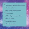 The design is printed onto gorgeous quality textured card, backed onto a matching colour background (may not be the colour shown depending on stock levels), which can be personalised with any name or wording of your choice along the bottom