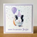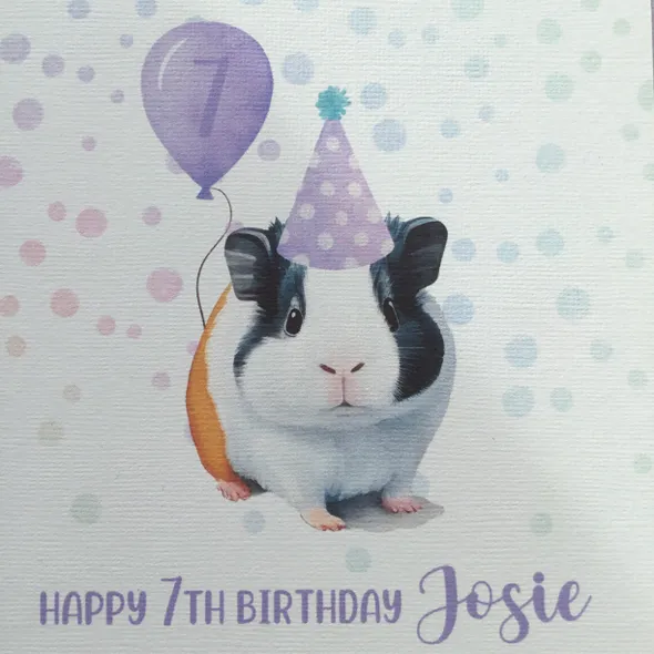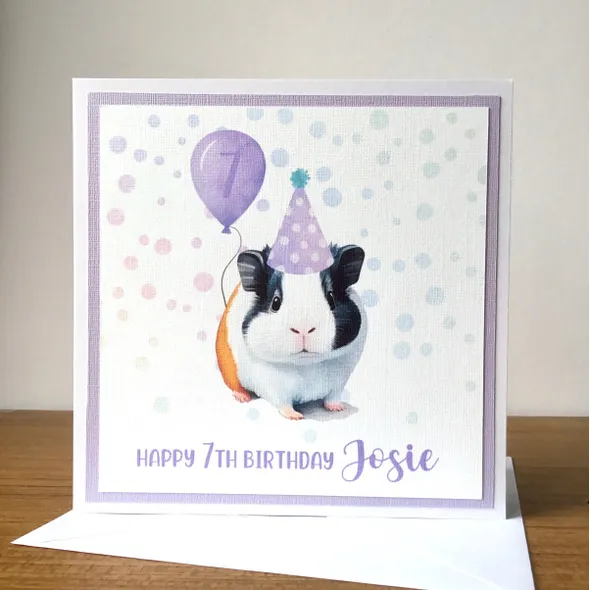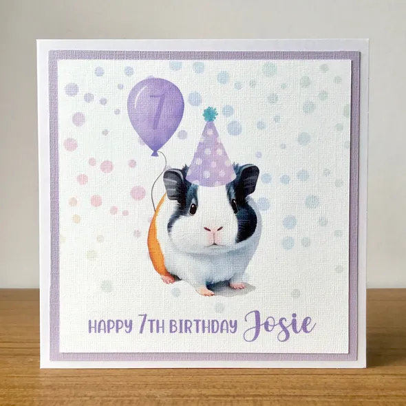 Celebrate in style with our cute personalised Guinea Pig birthday card which any Guinea Pig lover would adore. This square card features a cheerful Guinea Pig wearing a party hat with a balloon, set against a whimsical pastel rainbow dot background. This birthday card would be perfect for your daughter, grand daughter or niece.