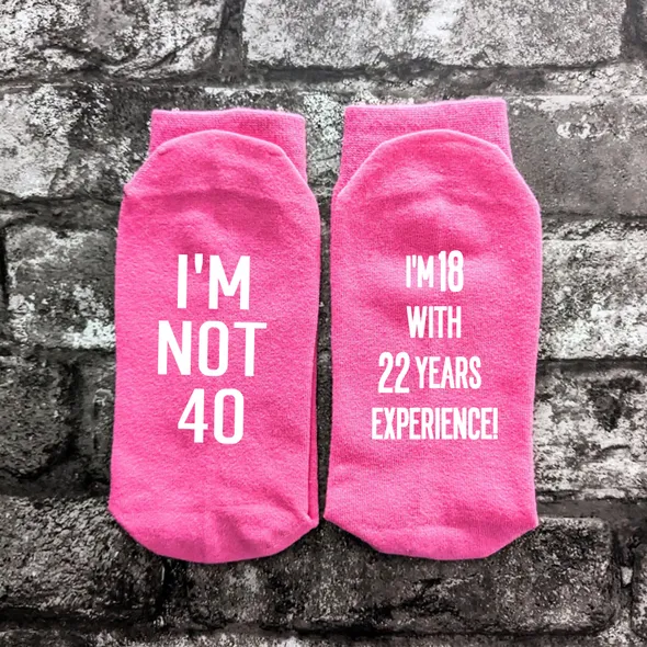 Novelty socks.Great humorous gift, perfect for a novelty 40th birthday. Give someone the socks they never knew they needed! These socks are available in men's or woman's sizes and as trainer or normal socks. All of my items are made using high quality heat transfer vinyl with an industrial heat press. PLEASE NOTE: THESE ARE NOT THICK SPORTS SOCKS, THEY ARE THE THINNER DRESS SOCKS.Washing:Please wash at 40° or lower with similar colours. Ironing:Please iron inside out. Do not iron design.Colours may appear different due to monitors/screen.Please ensure you have purchased the correct size and style before ordering. All our items are made to order. <<<<<< Please remember we are UK based & as such may be in a different time zone to you, so please be aware that there may be a delay in response to conversations. >>>>>>****************************************************************************************************************************************************************<<<<<< Shipping Information >>>>>>We are UK based and ship most items by Royal MailUK: 2nd Class Royal Mail – following dispatch expect delivery within 2-5 days.UK UPGRADE TO 1st Class – following dispatch expect delivery within 1-2 daysEUROPE: Royal Mail International Standard - following dispatch expect delivery within 5-14 days. THIS SERVICE IS NOT TRACKED. EUROPEAN UPGRADE: Royal Mail International Tracked or Tracked and Signed - following dispatch expect delivery within 5-14 days.RUSSIA: Tracked or Tracked & Signed only.USA, AUSTRALIA & NEW ZEALAND: Royal Mail International Standard: IF YOU CHOOSE THIS OPTION IT IS NOT TRACKED – following dispatch expect delivery in 2-5 weeks (this may be longer during holiday periods).USA, AUSTRALIA & NEW ZEALAND UPGRADE: Royal Mail International Tracked - following dispatch expect delivery within 2-5 weeks.CANADA: Royal Mail International Tracked - following dispatch expect delivery within 2-5 weeks (this may be longer during holiday periods).Please note that we cannot be held responsible for any delays at Customs or otherwise due to Strikes, Weather Conditions or other unforeseen circumstances outside of our control.PLEASE NOTE that in all cases our Standard Shop Processing Times still apply *** If your order is Time Sensitive please let us know as soon as possible, ideally before making a purchase so that we can advise you accordingly if your need by date is achievable. ********************************************************************************************************************************************************************<<<<<< Delivery Information >>>>>>Any Items ordered by you will be delivered to the address that you supplied to Etsy. If any of the details in your delivery address that you gave us are incorrect, we are not liable for any items not received.You may request an address for delivery that is different to your billing address, if, for example, you would like us to deliver the items directly to a friend, a relative, or to your place of work.Delivery will be made as soon as possible, all delivery and dispatch timescales quoted do not include weekends or bank holidays.Some postal addresses in Northern Ireland, some offshore islands and some remote areas of Great Britain may not be covered by our normal delivery services and so we may have to contact you to advise you of extra postal charges.