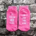 Novelty socks.Great humorous gift, perfect for a novelty 40th birthday. Give someone the socks they never knew they needed! These socks are available in men's or woman's sizes and as trainer or normal socks. All of my items are made using high quality heat transfer vinyl with an industrial heat press. PLEASE NOTE: THESE ARE NOT THICK SPORTS SOCKS, THEY ARE THE THINNER DRESS SOCKS.Washing:Please wash at 40° or lower with similar colours. Ironing:Please iron inside out. Do not iron design.Colours may appear different due to monitors/screen.Please ensure you have purchased the correct size and style before ordering. All our items are made to order. <<<<<< Please remember we are UK based & as such may be in a different time zone to you, so please be aware that there may be a delay in response to conversations. >>>>>>****************************************************************************************************************************************************************<<<<<< Shipping Information >>>>>>We are UK based and ship most items by Royal MailUK: 2nd Class Royal Mail – following dispatch expect delivery within 2-5 days.UK UPGRADE TO 1st Class – following dispatch expect delivery within 1-2 daysEUROPE: Royal Mail International Standard - following dispatch expect delivery within 5-14 days. THIS SERVICE IS NOT TRACKED. EUROPEAN UPGRADE: Royal Mail International Tracked or Tracked and Signed - following dispatch expect delivery within 5-14 days.RUSSIA: Tracked or Tracked & Signed only.USA, AUSTRALIA & NEW ZEALAND: Royal Mail International Standard: IF YOU CHOOSE THIS OPTION IT IS NOT TRACKED – following dispatch expect delivery in 2-5 weeks (this may be longer during holiday periods).USA, AUSTRALIA & NEW ZEALAND UPGRADE: Royal Mail International Tracked - following dispatch expect delivery within 2-5 weeks.CANADA: Royal Mail International Tracked - following dispatch expect delivery within 2-5 weeks (this may be longer during holiday periods).Please note that we cannot be held responsible for any delays at Customs or otherwise due to Strikes, Weather Conditions or other unforeseen circumstances outside of our control.PLEASE NOTE that in all cases our Standard Shop Processing Times still apply *** If your order is Time Sensitive please let us know as soon as possible, ideally before making a purchase so that we can advise you accordingly if your need by date is achievable. ********************************************************************************************************************************************************************<<<<<< Delivery Information >>>>>>Any Items ordered by you will be delivered to the address that you supplied to Etsy. If any of the details in your delivery address that you gave us are incorrect, we are not liable for any items not received.You may request an address for delivery that is different to your billing address, if, for example, you would like us to deliver the items directly to a friend, a relative, or to your place of work.Delivery will be made as soon as possible, all delivery and dispatch timescales quoted do not include weekends or bank holidays.Some postal addresses in Northern Ireland, some offshore islands and some remote areas of Great Britain may not be covered by our normal delivery services and so we may have to contact you to advise you of extra postal charges.