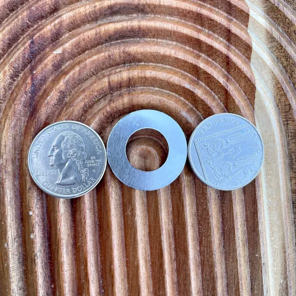 ⭕️ 25mm aluminium washer metal stamped with the design on one side, hung on sturdy plastic covered stainless steel wire with secure twist connector. The wire is 15cm long making a loop approx. 5cm diameter, which holds its circular shape when in use.