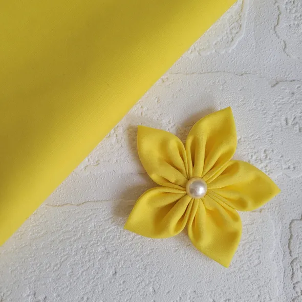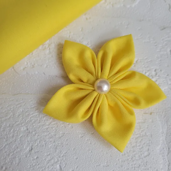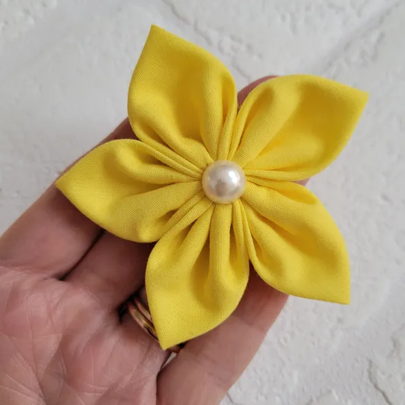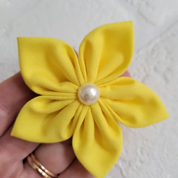 This handmade, bright yellow flower can be made as a hair bobble, hair clip or brooch.It has individually hand sewn petals, it is then embellished with a faux pearl.SIZINGThe flower is approximately 8cm (3 inches) in diameter.This can also be requested as a larger flower 13cm (5") which can be seen in other colours here: https://www.etsy.com/uk/listing/522831733Please message me to order the large flower version of this.CUSTOM REQUIREMENTSPlease contact me if you have any special requests, I will always do my best to meet your requirements.PLEASE NOTEThis product is NOT a toy.It contains small jewels or embellishments.Each item is handmade so may vary slightly in appearance.MY SHOPPlease take a look around at other items in my store, you will find lots of other pretty items at http://www.inspiredbymyla.etsy.comSHIPPINGItems will come packaged and presented nicely. I take care with all my items to make buying from me an experience I hope you will repeat!SOCIAL MEDIADon't forget to look me up on Facebook and Instagram @InspiredByMyla. Come and join our VIP group where I share all the latest products and updates!