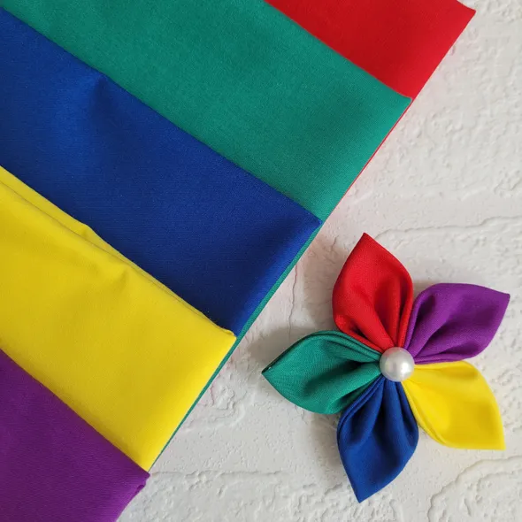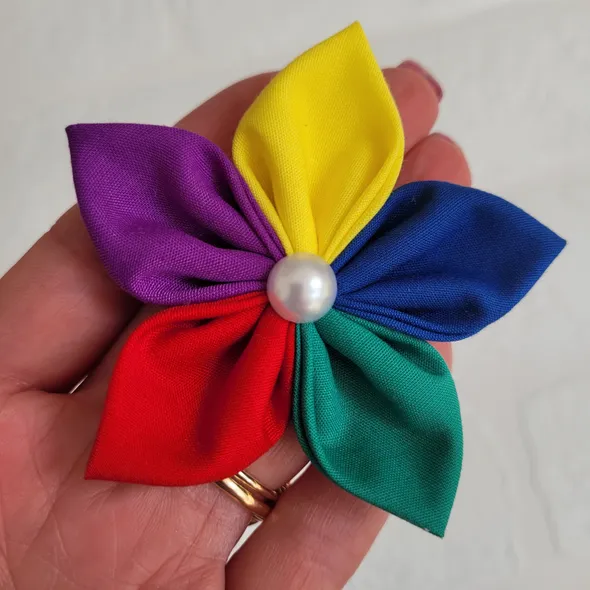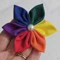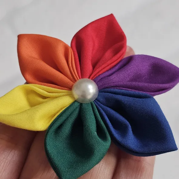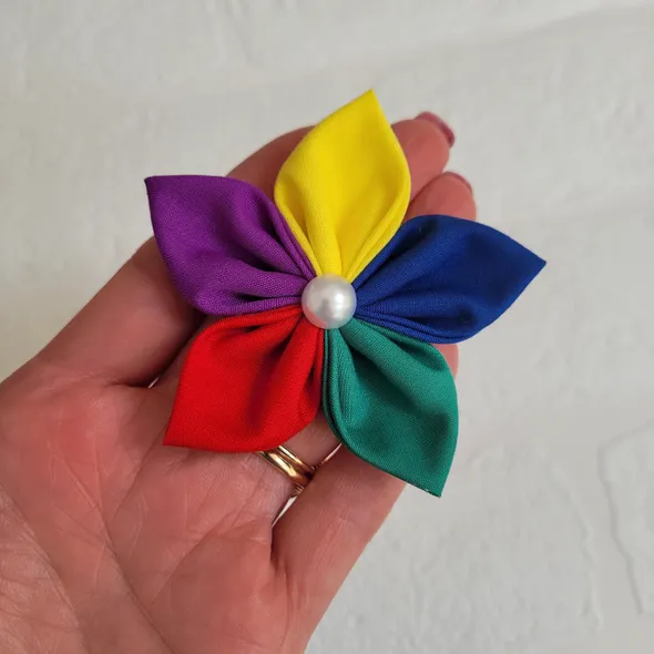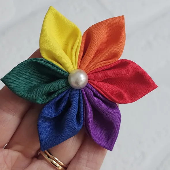 This handmade, rainbow flower can be made as a hair bobble, hair clip or brooch.It has individually hand sewn petals, it is then embellished with a faux pearl.SIZINGThe flower is approximately 8cm (3 inches) in diameter.CUSTOM REQUIREMENTSPlease contact me if you have any special requests, I will always do my best to meet your requirements.PLEASE NOTEThis product is NOT a toy.It contains small jewels or embellishments.Each item is handmade so may vary slightly in appearance.MY SHOPPlease take a look around at other items in my store, you will find lots of other pretty items at http://www.inspiredbymyla.etsy.comSHIPPINGItems will come packaged and presented nicely. I take care with all my items to make buying from me an experience I hope you will repeat!SOCIAL MEDIADon't forget to look me up on Facebook and Instagram @InspiredByMyla. Come and join our VIP group where I share all the latest products and updates!