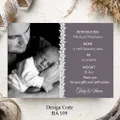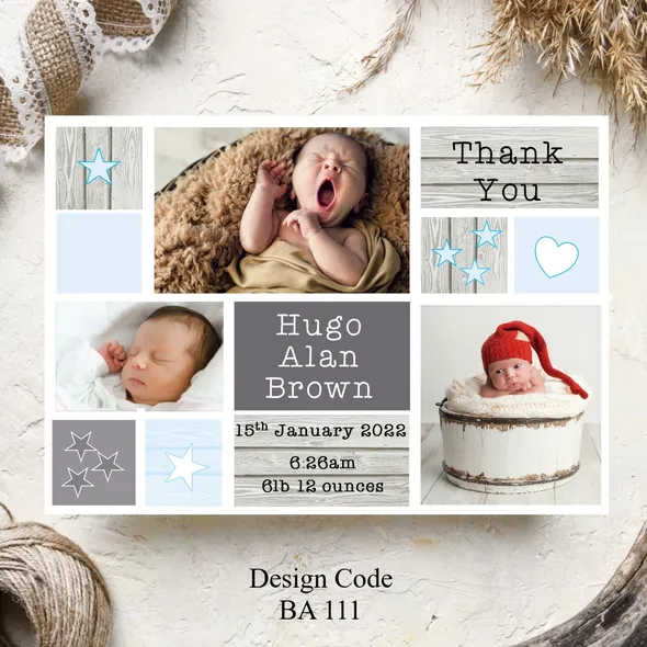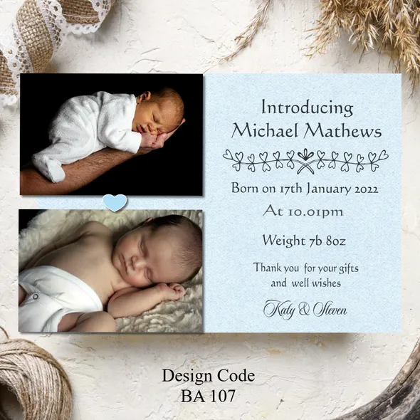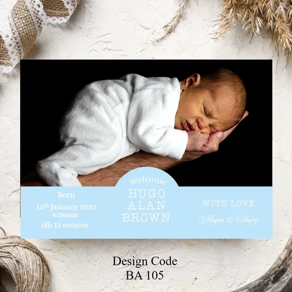 Another branch has been added to your family tree and you want to share you joyous news with the family and friends. We’ve created and designed delightful Personalised Birth Announcement Cards just for you. We have baby boy birth announcement cards also baby girl birth announcement cards. All designs can be changed to Thank You cards.Card size A6 105mm x 148mm Any questions please message carole@cpprintservices.co.uk