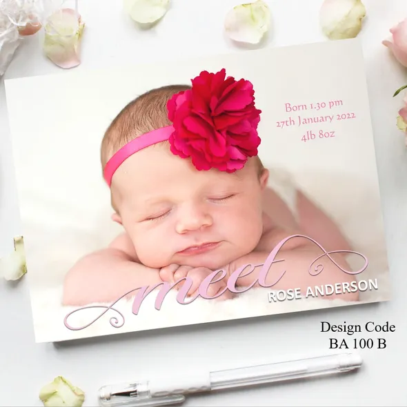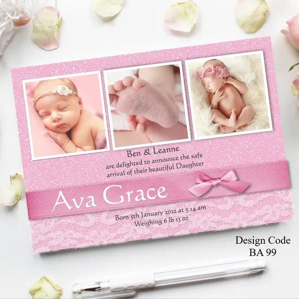 Another branch has been added to your family tree and you want to share you joyous news with the family and friends. We’ve created and designed delightful Personalised Birth Announcement Cards just for you. We have baby boy birth announcement cards also baby girl birth announcement cards. All designs can be changed to Thank You cards.Card size A6 105mm x 148mm Any questions please message carole@cpprintservices.co.uk