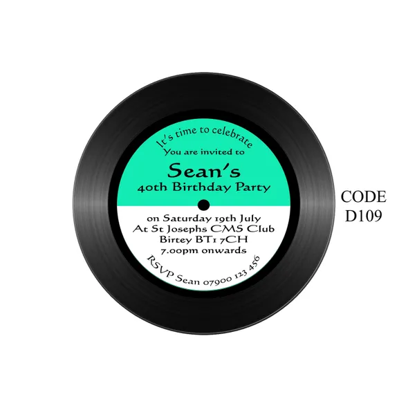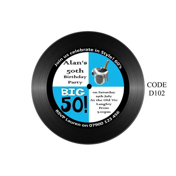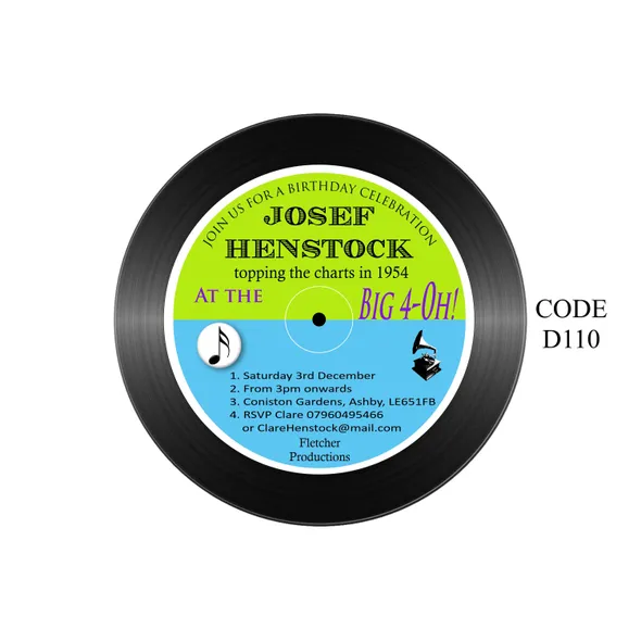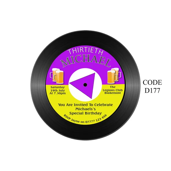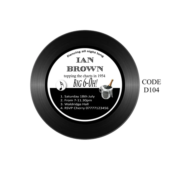 Men’s Circular Record Style Party Invitations cards, these Unique circular 145mm invitations are for any party occasions. Invite family and friends with these very different personalised invitations with your own wording or use the text example on the design sample. The invitations are printed on 300gsm quality card and not actual 45 vinyl disc’s. You can have a Single Sided invitation or if you have more details have them printed Double Sided option. Size when die cut 145mm. You will be the talk of the town with these personalised Circular Record Style Party Invitations. All of the invitation card samples are fully customisable. So just let us know if you would like to change the wording also colours, fonts, background on any design code sample.If you have any questions before placing your order please send a message and Carole will reply within 24 hours.
