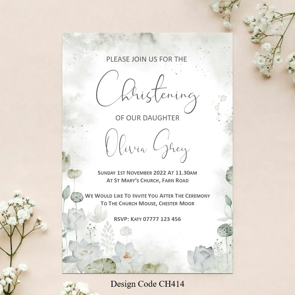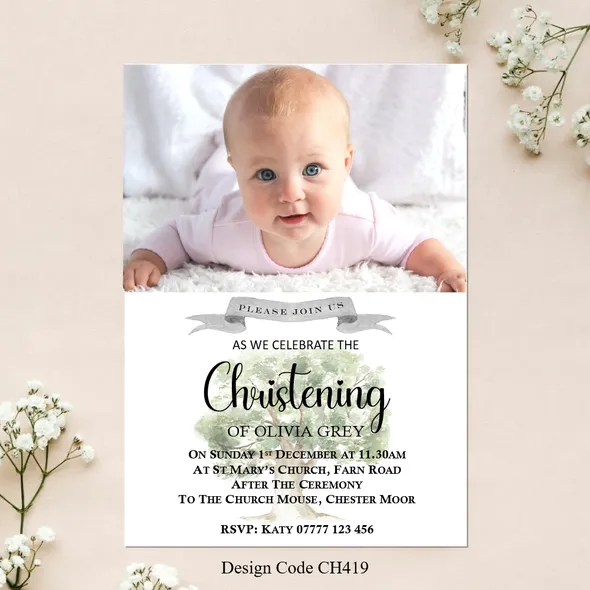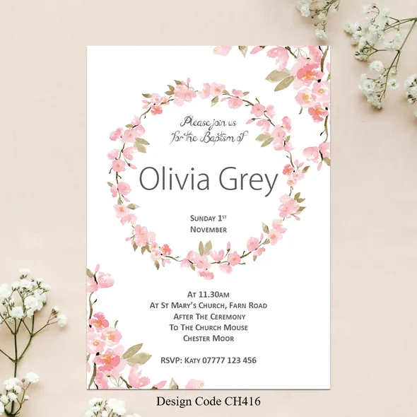 Girls Personalised Christening invitation cards size A6 105mm x 148mm digitally printed on 300GSM quality card. The time has come to have your daughter to be Christened or Baptised. With our design invitations you can personalise with your favourite photo or photo’s as you require.Choose your favourite Girl’s Christening invitation card design, then email us with the design wording or if you have your own you would like to use please email that with your own photos. We will design a proof of the design you have chosen and email a proof for you to check all details are correct before we send to print.If you have any questions please send a message to email carole@cpprintservices.co.uk