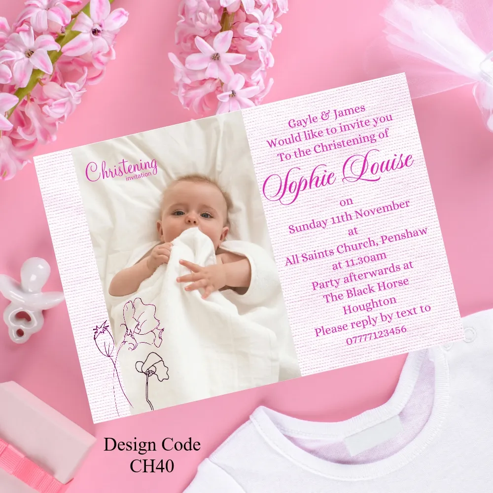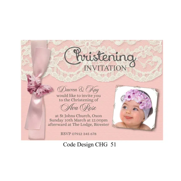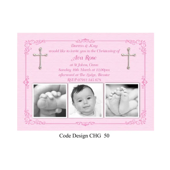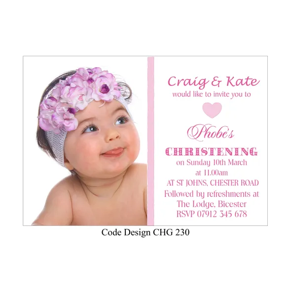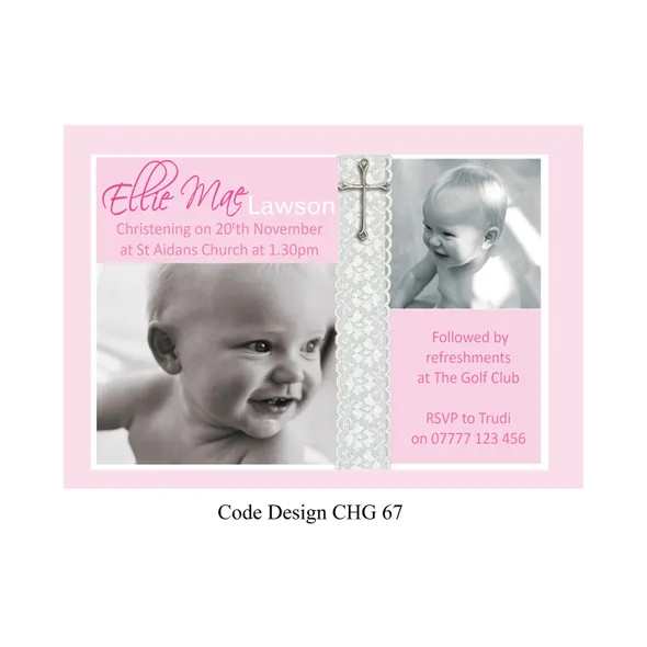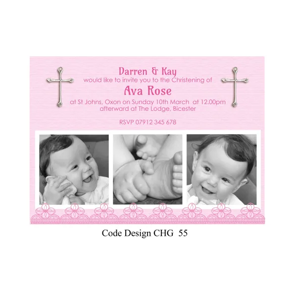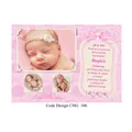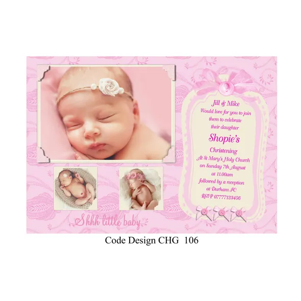 Girls Personalised Christening invitation cards size A6 105mm x 148mm digitally printed on 300GSM quality card. The time has come to have your daughter to be Christened or Baptised. With our design invitations you can personalise with your favourite photo or photo’s as you require.Choose your favourite Girl’s Christening invitation card design, then email us with the design wording or if you have your own you would like to use please email that with your own photos. We will design a proof of the design you have chosen and email a proof for you to check all details are correct before we send to print.If you have any questions please send a message to email carole@cpprintservices.co.uk