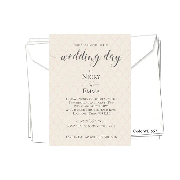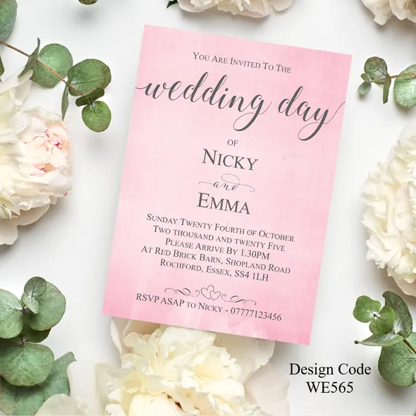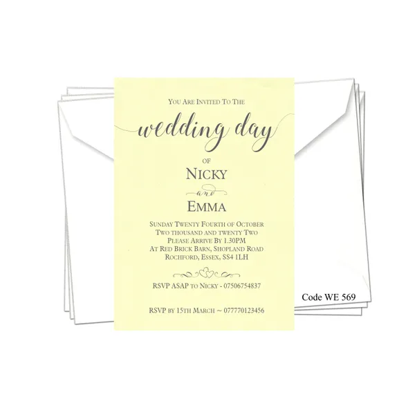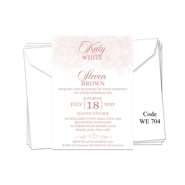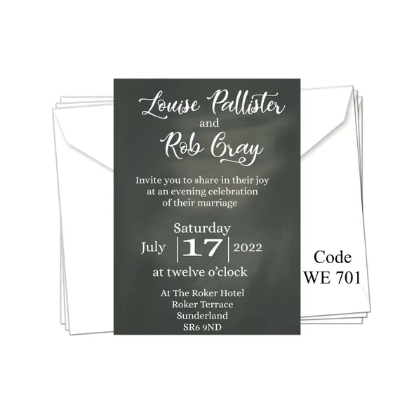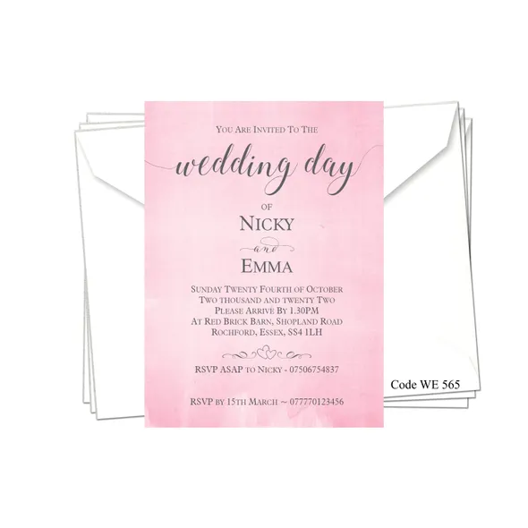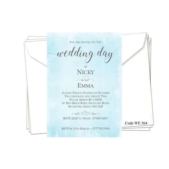 Personalised Wedding Day or Evening Reception Invitation cards.Printed full colour on 300gsm card - size 5" x 7"All Wedding Day Stationery you require for your special day. We have various Wedding Day Ceremony Invitations and Evening Reception Invitations cards to chose from. All Professional designed, also text fully personalised according to your requirements.If you don't like the styles we have listed we can do a bespoke style, in fact anything about our invitations can be changed.We are happy to discuss your requirements before you place your order, if you have any queries please email carole@cpprintservices.co.uk