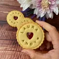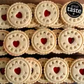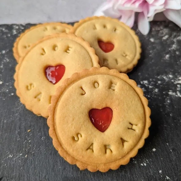 Up to 12 characters (incl. spaces) can be impressed around the edge of the biscuits. Messages over 12 characters are impressed in straight lines across the biscuit. The minimum order quantity for custom wedding names jam biscuits with the couple's names on is 10. For orders over 100 units or for other bespoke options, please email enquiries@thebiskery.com. We will happily work with you to create the most delicious impressed wedding jam biscuits for your requirements. All our biscuits are handmade and exclusively baked to order. Biscuit shape: round (fluted). We individually wrapped each jam biscuit in a compostable transparent bag. Ingredient labels and best before date are included on all of the biscuits. Our basic biscuit recipe is inspired by a traditional Austrian Christmas biscuit called Linzer cookie. Co-founder Lisa hails from the South of Germany. Our biscuit are made to her Grandmother’s Linzer recipe (excluding the nuts). The one and only Nigella Lawson described Linzer cookies on BBC Food as having a texture of “melting tenderness and celestial lightness” and the dough being “rich and short”.
