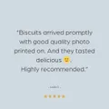 Transform recent family photos or old memories from picture books into a wonderful, delicious and memorable edible gift. A picture speaks a thousand words. And edible picture cookies tick all the boxes of thoughtfulness.And creating a box of perfectly personalised custom edible photo cookies is super easy. Simple send max three pictures (jpg, png) in an email to orders@thebiskery.com with your order number in the subject line and we will sort the rest! Looking for another type of biscuit? Why not check out our signature personalised jam biscuits or our fondant impressed message biscuits gift boxes? If you require more flexibility in terms of design and biscuit type for your gift idea, please have a look at our dedicated bespoke biscuits page. From there you can also contact us with your specific ideas. We would love to transform your vision into a biscuit!