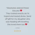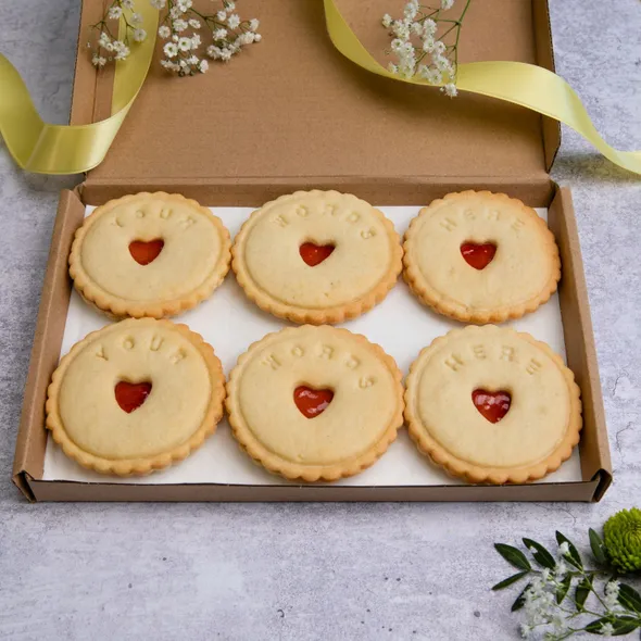 Biscuits with your words on them are a great gift to get your message across in the sweetest way!A box contains six large personalised biscuits impressed with up to three different messages of your choice: 6 x personalised message biscuits A gift note Free UK shipping As seen on BBC News! All message biscuit gift boxes are handmade to order. Each biscuit measures roughly 7.5 cm/3 inches in diameter. No matter the occasion, these jam biscuits make fabulous gifts. Whilst personalised iced biscuits are on everyone’s lips, these jam biscuits are out of this world. Not only can they be personalised with your words, but the tart jam offsets the sweetness, creating the perfect balance and a truly delicious product. Whether you want to let someone know you are thinking of them, or are sending them as a treat for a special occasion, our jam biscuits are guaranteed to make the recipient smile! Plus you will earn some brownie points for the thoughtful letterbox-friendly gift! Looking for a gift box for another occasion? Browse our collections. If you require more flexibility in terms of design and biscuit type for your gift idea, please have a look at our dedicated bespoke biscuits page. From there you can also contact us with your specific ideas. We would love to transform your vision into a biscuit! From there you can also contact us with your specific ideas. We would love to transform your vision into a biscuit! — Our signature jam biscuits are inspired by a traditional Austrian Christmas biscuit called Linzer cookie. Co-founder Lisa hails from the South of Germany, and our jam biscuits are made to her Grandmother’s Linzer recipe (excluding the nuts). Nigella Lawson wrote about Linzer cookies on BBC Food. Her words perfectly convey how truly special these biscuits are: “In its wildest dreams, a jammy dodger could never aspire to the melting tenderness and celestial lightness of the Linzer cookie. The idea is the same: two biscuits, sandwiched together with jam, a hole or small shape cut out of the top one, so that the jam glints beckoningly through. But the Linzer cookie’s dough is rich and short. It’s the extravagant Austrian Christmas version.”