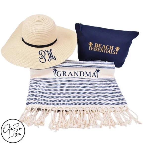 Personalised Beach Towel With Floppy Hat and Bag Set. This Gorgeous Luxury Turkish Towel and Floppy Hat set is the perfect accessory for your Honeymoon or Beach Trip. Welcome to Oh So Liza and thank you for visiting my shop. Have you been looking for the perfect gift with style to show off this summer, this boardwalk beach bag delivers as a key statement piece for fans of the popular maxi-bag style. Then add in the Turkish Beach Towel with a Beach Essentials Mini Bag it shouts Chic all the way to the beach. The bag offers a chunky rope carry handle offering a classic nautical styling while premium brushed canvas makes this a robust choice for a day at the beach. With an inside zipper pocket to keep your small items safe on the sand. The towel can be folded to a very compact package and the essentials bag keeps all those littler items in one place. The perfect go to Beach Set for any occasion. ???? ABOUT YOUR BEACH HAT, BEACH TOWEL AND ESSENTIALS BAG SET ???? ************FLOPPY HAT************* Marbella wide-brimmed sun hat, Domed crown, Wide-brimmed design, Please see the Gallery for Sizing of the Hat **********TURKISH BEACH TOWEL************* These beautiful towels are handwoven in an authentic way according to traditional patterns. This makes this towel very special and so very beautiful. The towels are made of 100% cotton, weigh only 430 gram and can be folded to a very compact package. Therefore, they are ideal for transport in your suitcase, backpack or beach bag. Take them on trips to the beach, to your boat, to the swimming pool, to the sauna or to the gym. Hamamzz® are traditionally woven in Turkey. The tassels are twisted and knotted by women by hand. Size One size (100 x 180cm) OR (40inches x 71 inches) ***ABOUT YOUR PLAIN ESSENTIAL BAG** Cotton Canvas Bag in PLAIN Black, Navy, Pink, Gray, Off White and Natural With A Durable Metal Vintage style metal. Dimensions L - 13 x 9 x 4.3 Inches, Perfect for your all your Creams ect ???? HOW TO ORDER???? 1. Select the Colour Towel you Would Like (from the drop down menu) 2. Select the Colour Essential Bag you would like in your set 3. Your Beach Hat will always be natural. Include in the Message the Thread Colour you would like on your Hat, Essentials bag and Towel . If you can also leave the Name or Text for Towel and Monogram Design with Initials for for the monogram. NB (The thread colour will always be used to match the towel unless otherwise stated) Example We need 1 set Beach Hat Monogram Chic L in Pink to match towel Natural Essentials Bag Hot Pink Text ( Beach Essentials) to match towel Towel Pink Text Liza in Pink to match towel *THIS LISTING IS FOR THE PERSONALISED BAG, TOWEL ONLY, PROPS NOT INCLUDED* **If you would like a custom listing for a larger quantity of bags then please let me know and I will sort this out for you asap. Colours may appear different due to monitors/screens. Thank you for shopping with me. Oh Liza © All designs and images belong to OhSoLiza and are subject to Copyright - do not replicate in any way.