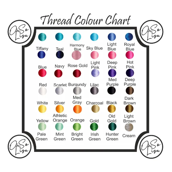 Initials will be embroidered in the order provided along with thread colour of your choice. Unless otherwise stated a colour will be chosen to match the bag. Please see below of standard thread colour.