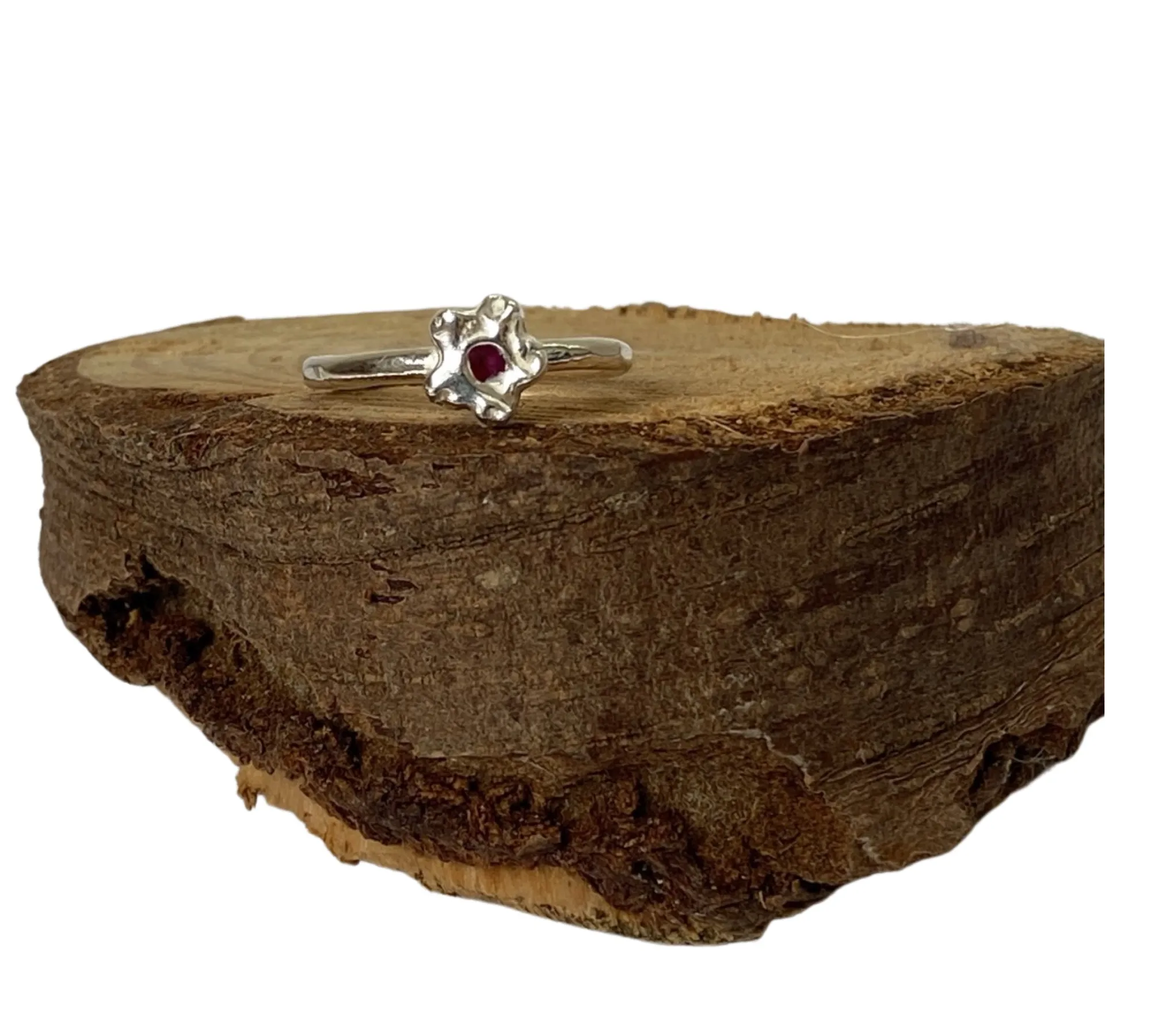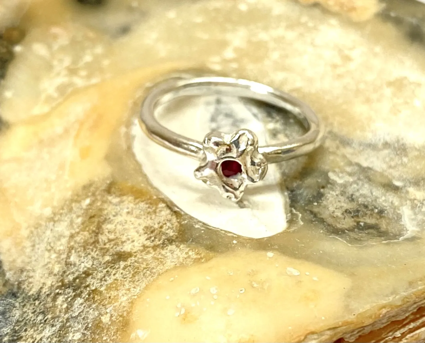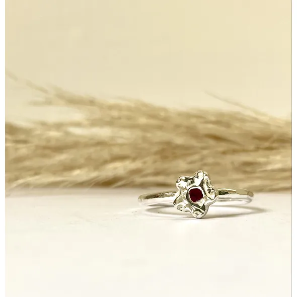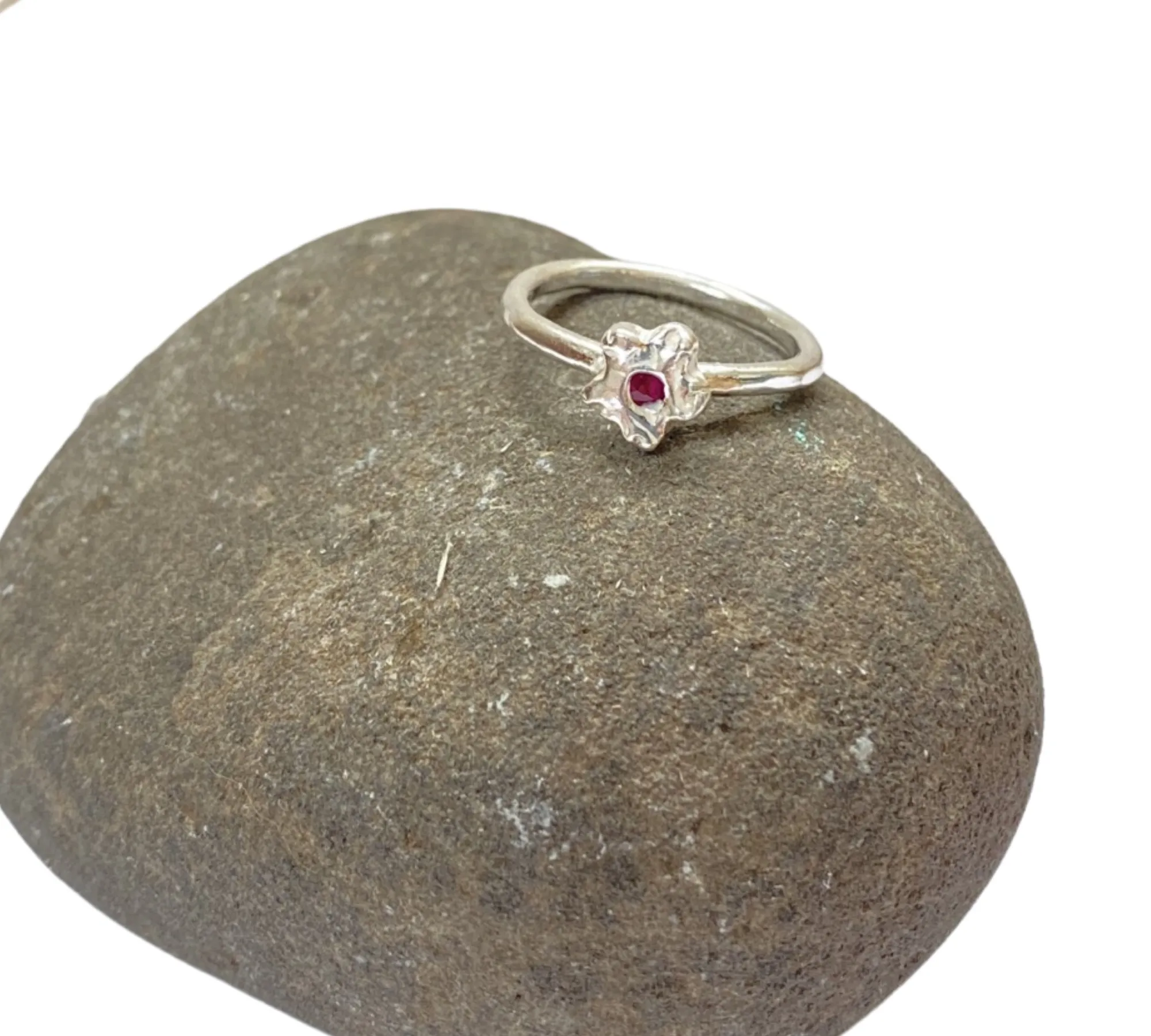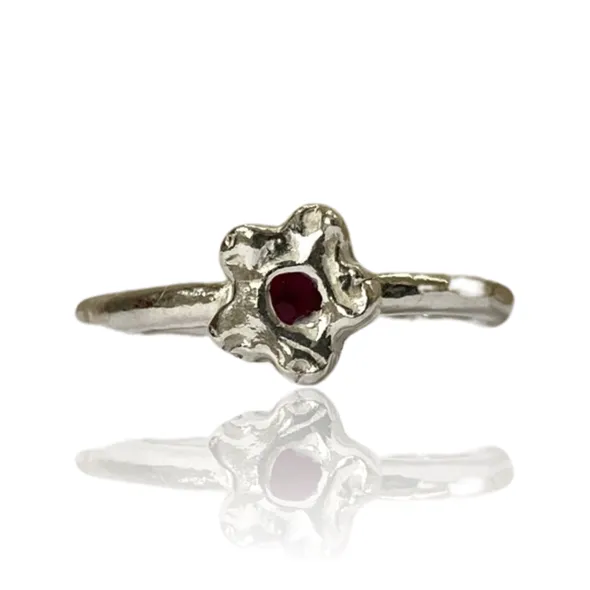 The bursting, pretty 99.9% fine silver flowerbomb with a red stone crystal which has been cast onto a 925 Sterling Silver band ring. The ring is all handmade and highly polished with a hammered effect