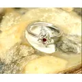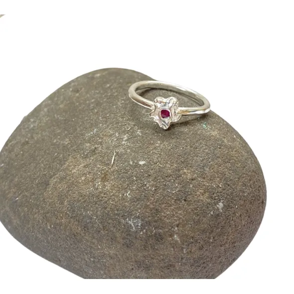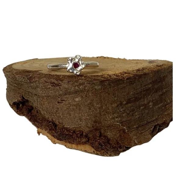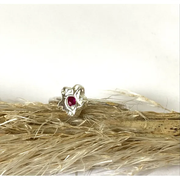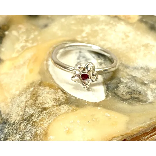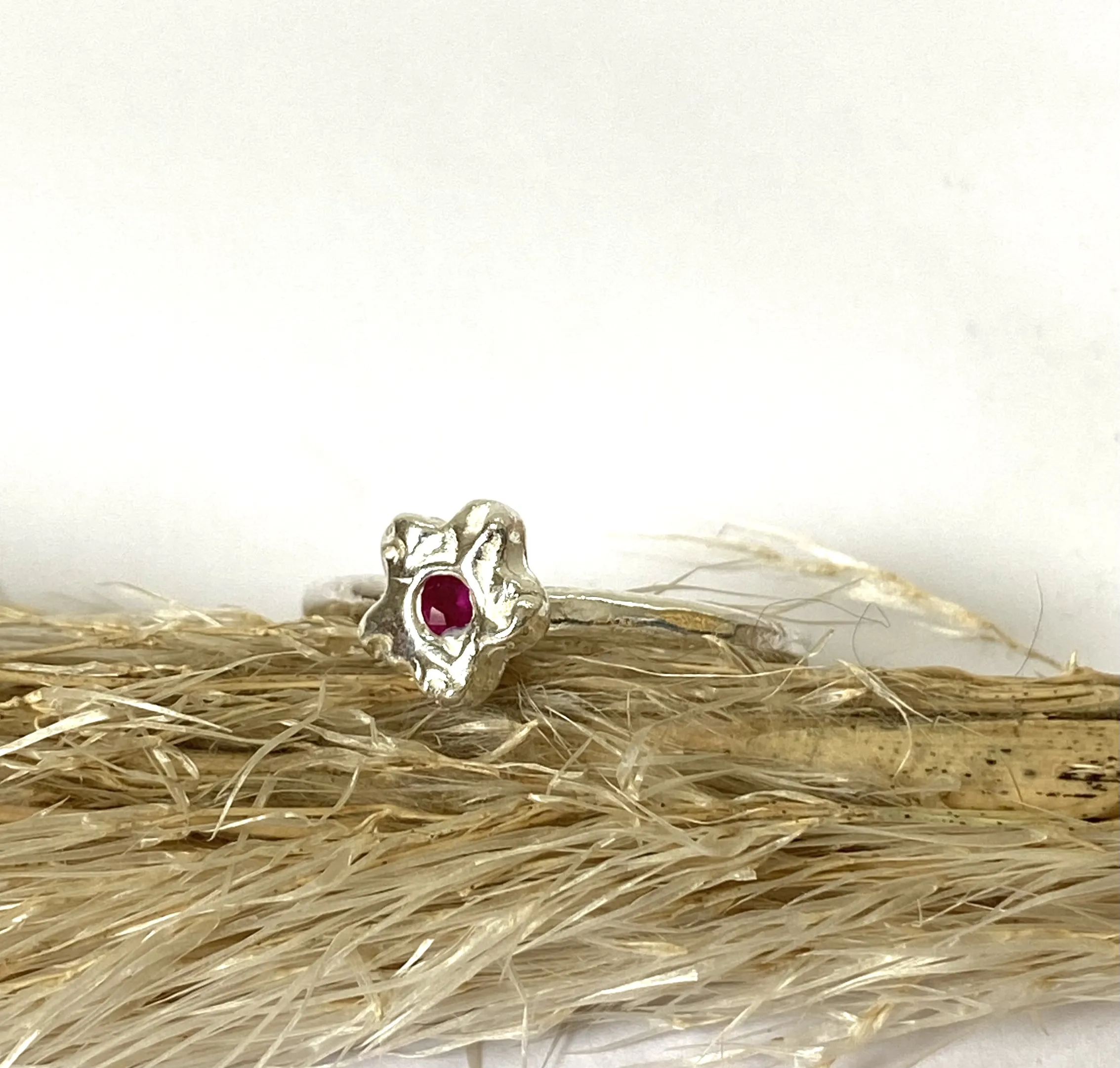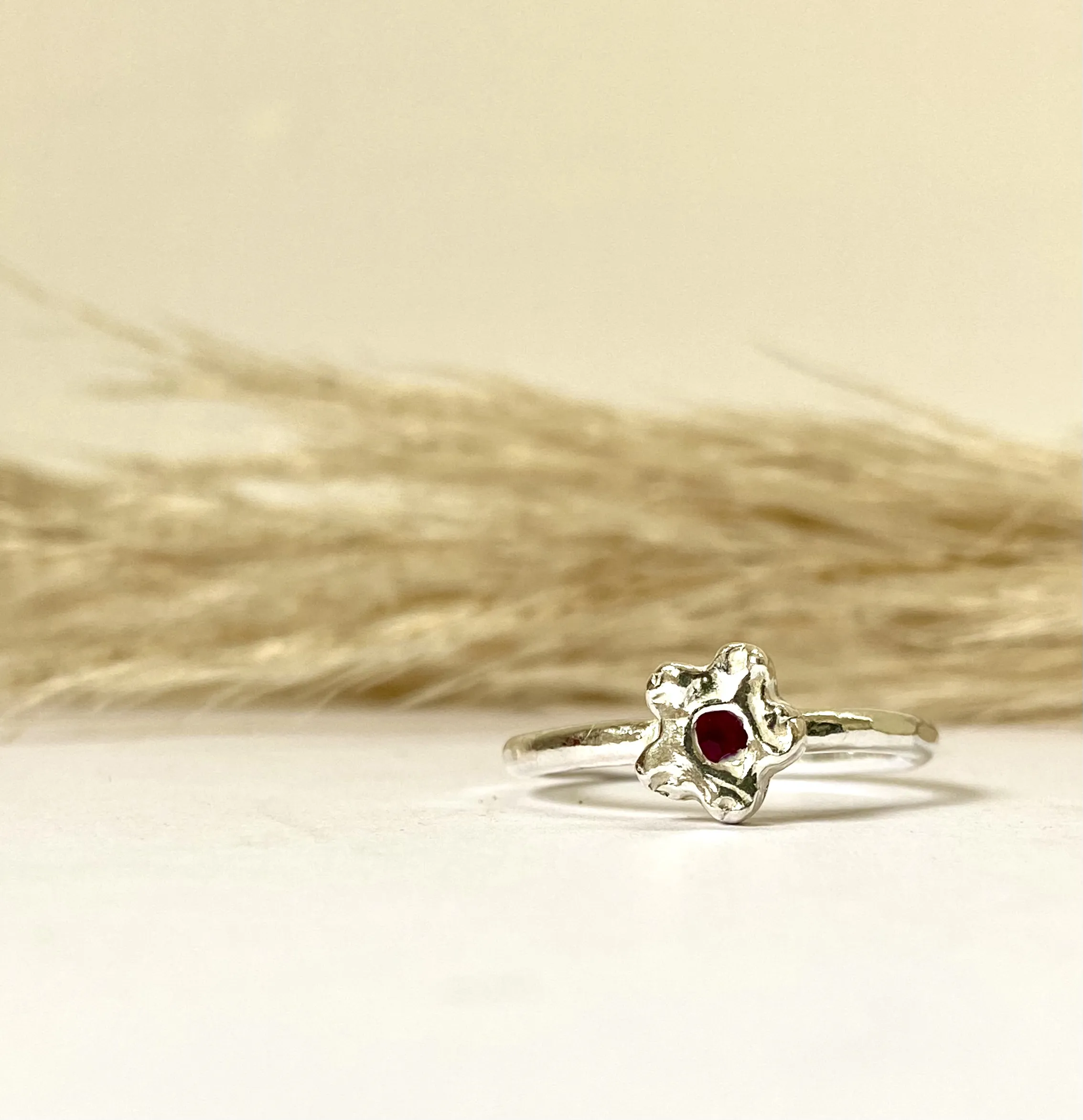 The bursting, pretty 99.9% fine silver flowerbomb with a red stone crystal which has been cast onto a 925 Sterling Silver band ring. The ring is all handmade and highly polished with a hammered effect