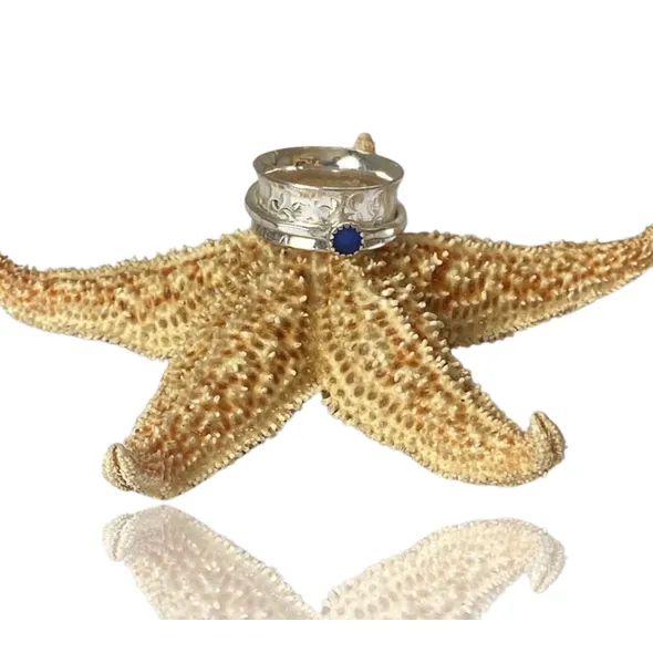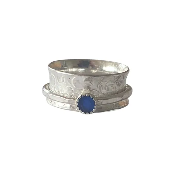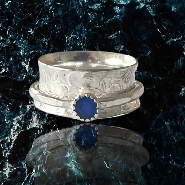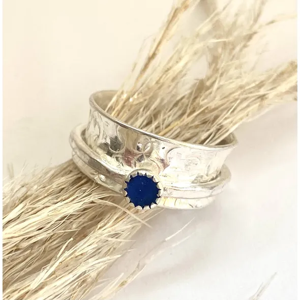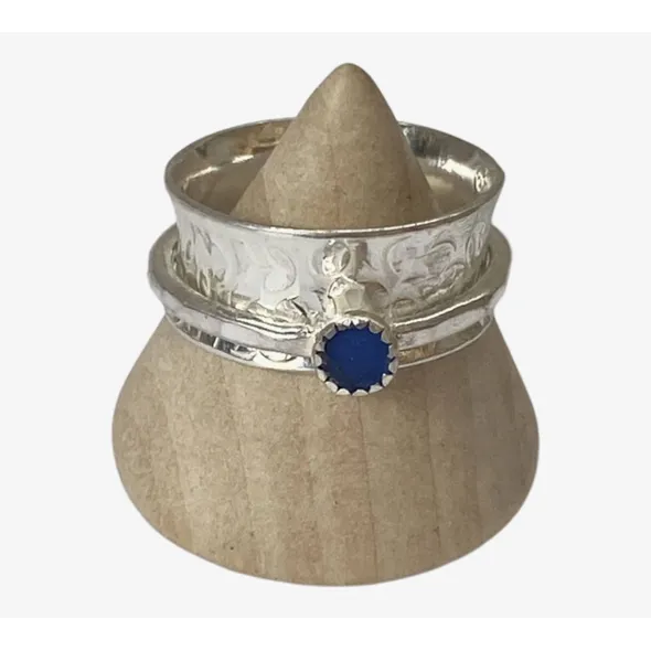 A unique Argentium silver sea glass spinner ring. The sterling silver band measuring 10mm with a 2mm sea glass spinner. With a hammered finish. I shape the piece of sea glass by hand to form a beautiful round shape. Each piece I make is made with love.