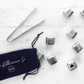 Our eco-friendly stainless steel ice cube sets are the perfect personalised gift. The design can be personalised with a name (the name will be engraved on two of the cubes). Due to the size of the cubes we can only fit 7 characters for the name. If you require a longer name please contact us prior to placing an order. This set of 8 reusable ice cubes is made from the highest quality food grade stainless steel and comes gift boxed with a set of tongs and a velvet pouch for storage. The design is repeated on the underside of each cube. Undiluted style - These stylish reusable ice cubes will chill your drink or keep it cool without diluting the flavour. - Simply place in the pouch in the freezer for a minimum of 4 hours then use the tongs to add as many cubes as you need to your drink to chill. - Perfect for whisky, gin, cocktails, white wine or cordials. Elegant, sustainable and eco-friendly - With their gently rounded corners, our stainless steel ice cubes are an elegant way to keep your drink cool. - Made from stainless steel 304 and meeting LFGB food safety requirements, these ice cubes are a sustainable and eco-friendly alternative to traditional ice cubes and plastic alternatives. - Using stainless steel ice cubes saves water and prevents water spills from ice trays in your freezer. Looking after your ice cubes Although your stainless steel ice cubes are dishwasher safe, we recommend rinsing with hot water only as soon as possible after use and leaving to air dry or drying with a soft cloth. Once dry, simply pop them back in the pouch and put them in the freezer and they will be ready to re-use in 4 hours. Dimensions Packaged set: width: 20.7cm, height:2.8cm, depth:16.5cm, weight:347.5g Individual ice cube: width: 2.7cm, height:2.7cm, length:2.7cm, weight:30g Ice tongs: length: 13.4cm, weight:26g