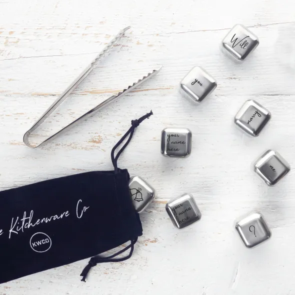 Looking for a quirky way to pop the question? Our personalised eco-friendly stainless steel ice cube sets are here to help! The design can be personalised with two names (each name will be engraved on one of the cubes). Due to the size of the cubes we can only fit 7 characters for each name. If you require a longer name please contact us prior to placing an order. This set of 8 reusable ice cubes is made from the highest quality food grade stainless steel and comes gift boxed with a set of tongs and a velvet pouch for storage. The design is repeated on the underside of each cube. Undiluted style - These stylish reusable ice cubes will chill your drink or keep it cool without diluting the flavour. - Simply place in the pouch in the freezer for a minimum of 4 hours then use the tongs to add as many cubes as you need to your drink to chill. - Perfect for whisky, gin, cocktails, white wine or cordials. Elegant, sustainable and eco-friendly - With their gently rounded corners, our stainless steel ice cubes are an elegant way to keep your drink cool. - Made from stainless steel 304 and meeting LFGB food safety requirements, these ice cubes are a sustainable and eco-friendly alternative to traditional ice cubes and plastic alternatives. - Using stainless steel ice cubes saves water and prevents water spills from ice trays in your freezer. Looking after your ice cubes Although your stainless steel ice cubes are dishwasher safe, we recommend rinsing with hot water only as soon as possible after use and leaving to air dry or drying with a soft cloth. Once dry, simply pop them back in the pouch and put them in the freezer and they will be ready to re-use in 4 hours. Dimensions Packaged set: width: 20.7cm, height:2.8cm, depth:16.5cm, weight:347.5g Individual ice cube: width: 2.7cm, height:2.7cm, length:2.7cm, weight:30g Ice tongs: length: 13.4cm, weight:26g