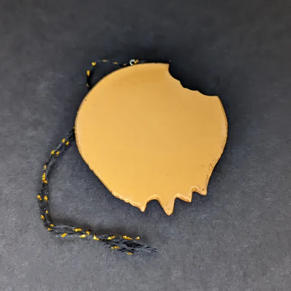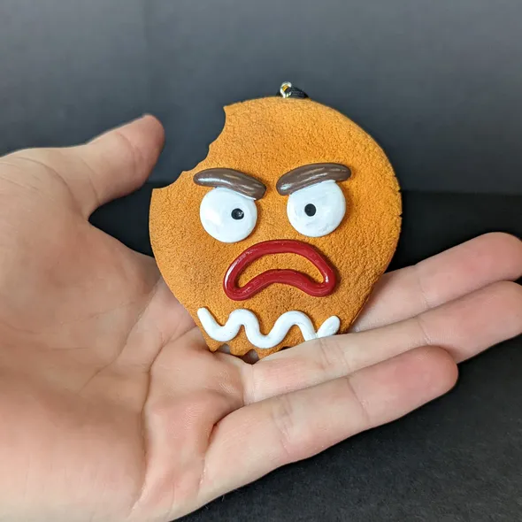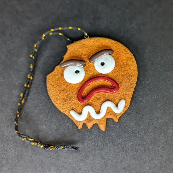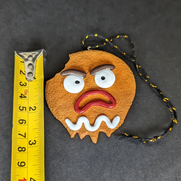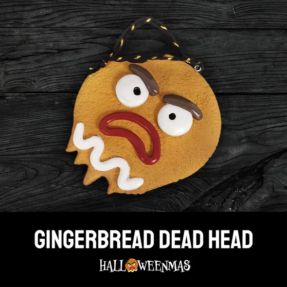 AKA "GINGE" \nGingerbread Dead Head looks good enough to eat... but don't*. \nBased on the Halloweenmas logo, this is the first in our range of exclusive handmade tree ornaments. \n \nEvery Halloweenmas ornament has been handmade and individually hand painted in the UK. \n \nComes in a black box which will be individually signed and numbered in white ink. \n \nThe black and gold string means the hanger will add a little sparkle to a black Halloweenmas tree without standing out too much. \n \n*Seriously, we've been asked... and this figure is NOT edible! \n \nEdition Number: 01 \nQuantity In This Edition: 50 \nDesign/concept: Alan Sawyers \nSculpt/Build/Paint: Cris Stewart (NEt00n Creative) \nDisplay Type: Hanging only \n \nNote: ornaments and boxes may look slightly different to photos, due to the handmade and hand-finished nature of the products.