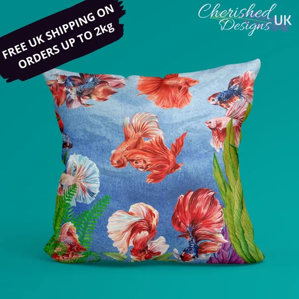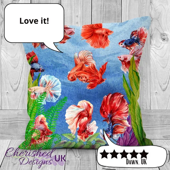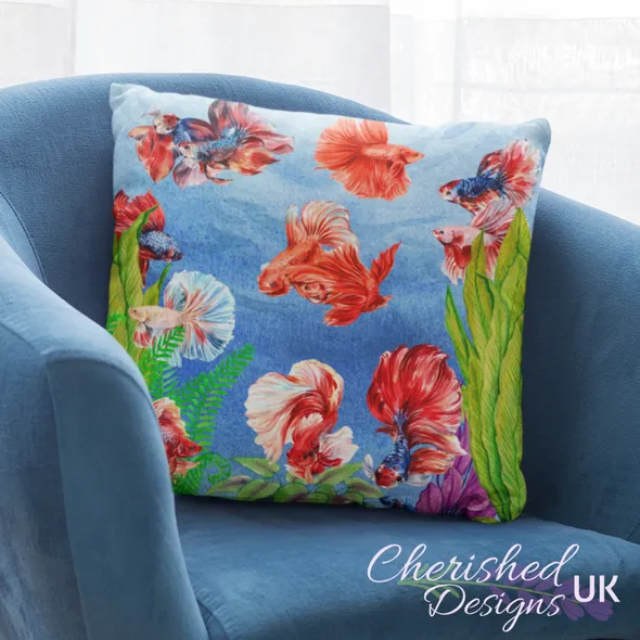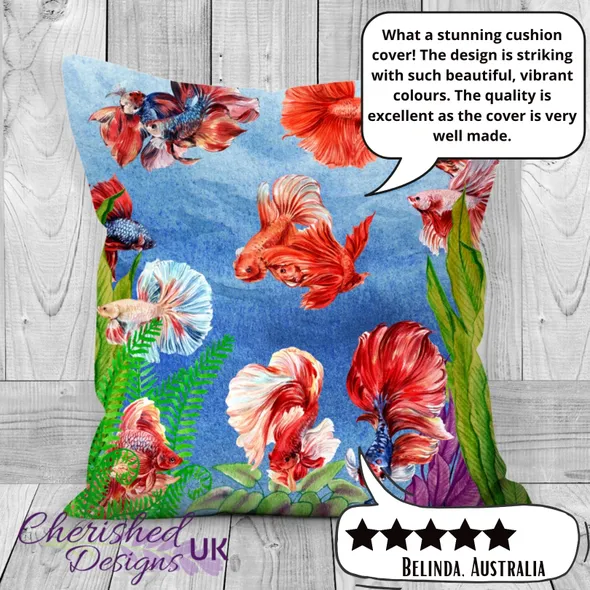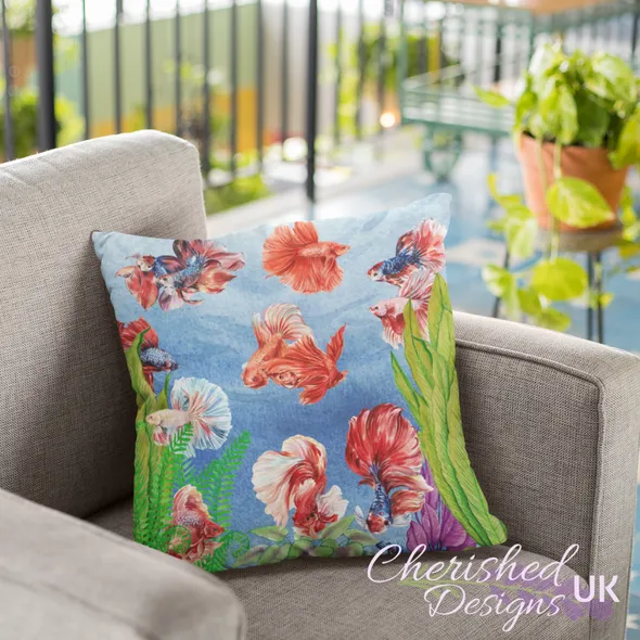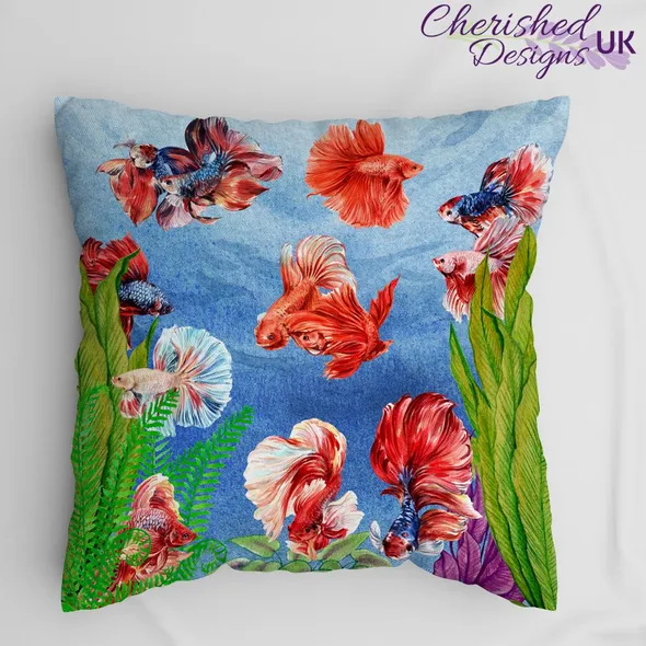 This Limited Edition Bevy of Betta Decorative cushion is so vibrant … just like the Siamese Fighting Fish. A watercolour design that is printed on both sides of the cushion make this the perfect gift for tropical fish lovers. All our cushions are 100% handmade in the UK using 100% spun poly linen. Our gorgeous cushions are printed using state of the art dye infusion technology giving you a permanent & wonderfully vibrant design.