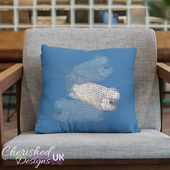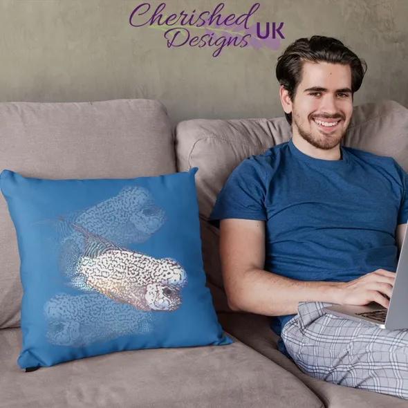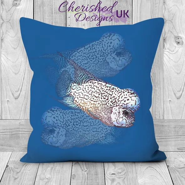 WELCOME TO CHERISHED DESIGNS UK … THANK YOU FOR CHECKING OUT OUR ITEM This stunning Flowerhorn cichlid fish drawn by our Designer DeeDee is sure to catch the eye of any Flowerhorn lover. A hint of metallic shades against a deep maroon body is just one of the reasons why Flowerhorn keepers are so obsessed with them. Also available as a desk gaming/mouse mat and canvas print we think this is the perfect gift especially as it's blue tones are so on trend this year! They are available in 30x30 cm (12"x12") … 45x45 cm (18"x18") and 60x60 cm (24"x24") sizes (please note the largest size is huge as stated by our customers!) Our cushions come with or without the plump inners... if you choose to have your cushions with an inner you will be pleased to know they are made from 100% hygienic faux fibre filling to give a plump yet luxurious feel, they conform to BS 5852 UK fire safety regulations. All our zips are sewn using an invisible style to provide a clean look and easy care provision. Our cushion covers can be fully machined washed without fear of the gorgeous image fading.