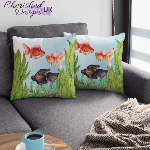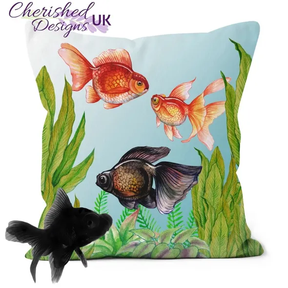 WELCOME TO CHERISHED DESIGNS UK … THANK YOU FOR CHECKING OUT OUR ITEM This striking Limited Edition Fancy Goldfish cushion is the perfect gift for fish lovers. Fancy Goldfish have been amongst the most popular of fish for many years with their vibrant colours and flowing fins giving them an elegance we admire. They are available in 30x30 cm (12"x12") … 45x45 cm (18"x18") and 60x60 cm (24"x24") sizes (please note the largest size is huge as stated by our customers!) Our cushions come with or without the plump inners... if you choose to have your cushions with an inner you will be pleased to know they are made from 100% hygienic faux fibre filling to give a plump yet luxurious feel, they conform to BS 5852 UK fire safety regulations. All our zips are sewn using an invisible style to provide a clean look and easy care provision. Our cushion covers can be fully machined washed without fear of the gorgeous image fading.