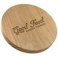 We are delighted to present our new range of British made carved chopping and presentation boards, hand crafted in British Oak. The entire process, from seasoning through selection, sawing, shaping, carving and oiling, results in each of our boards being totally unique, full of character and craftsmanship and quintessentially British. Each board is presented in a jute drawstring bag to protect the board.The board has its own unique characteristics depending on the tree and the part of the tree it originates from. Some will have decorative medullary rays on the edges or one or more faces. These rays are formed from ribbon like groups of cells which conveyed sap through the trunk of the Oak, putting them the heart of the growing process. Others will have small knots which have formed naturally during the growth cycle of the tree. Each board will also have its own unique colouring depending on the age and life of the tree it originates from. All of these naturally occurring characteristics add to the individuality of your chopping board.Wood has a natural tendency to curve with changes in humidity and the larger the surface area, the more prone the wood is to warping. Our round boards are made from two pieces of oak, carefully matched for grain pattern and colour and traditionally joined in opposing halves to create a natural tension within the board, minimising the risk of warping and cracking.The board features a âGood Food Good Timesâ design making it a perfect gift. The decorated board face is great for use as a presentation board when serving food. The other side of the board is left blank so it can be used as a chopping board. Board Specifications:- Diameter 29.5cm- Thickness 3.5cm- Weight 1.6 Kg-- Sourced from the highest quality British Oak and finished with food safe mineral oil to help protect the wood.