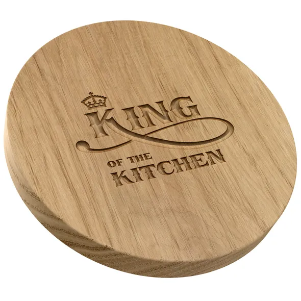 We are delighted to present our new range of British made carved chopping and presentation boards, hand crafted in British Oak. The entire process, from seasoning through selection, sawing, shaping, carving and oiling, results in each of our boards being totally unique, full of character and craftsmanship and quintessentially British. Each board is presented in a jute drawstring bag to protect the board.The board has its own unique characteristics depending on the tree and the part of the tree it originates from. Some will have decorative medullary rays on the edges or one or more faces. These rays are formed from ribbon like groups of cells which conveyed sap through the trunk of the Oak, putting them the heart of the growing process. Others will have small knots which have formed naturally during the growth cycle of the tree. Each board will also have its own unique colouring depending on the age and life of the tree it originates from. All of these naturally occurring characteristics add to the individuality of your chopping board.Wood has a natural tendency to curve with changes in humidity and the larger the surface area, the more prone the wood is to warping. Our round boards are made from two pieces of oak, carefully matched for grain pattern and colour and traditionally joined in opposing halves to create a natural tension within the board, minimising the risk of warping and cracking.The board features a âKing of the Kitchenâ design making it a perfect gift. The decorated board face is great for use as a presentation board when serving food. The other side of the board is left blank so it can be used as a chopping board. Board Specifications:- Diameter 29.5cm- Thickness 3.5cm- Weight 1.6 Kg-- Sourced from the highest quality British Oak and finished with food safe mineral oil to help protect the wood.