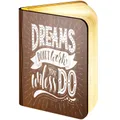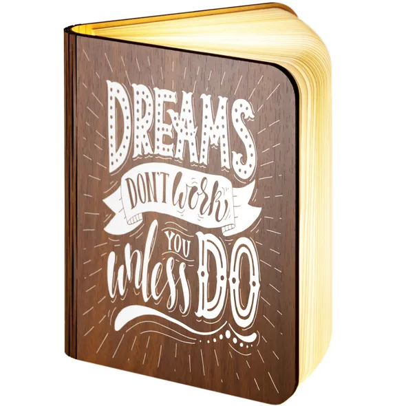 Our wooden folding magnetic glowing LED book light is an ideal gift which makes a stunning gift for any recipient.It opens like a book, and the special hinge design allows you to change its shape according to your needs. Whether you are in the living room or your child is reading a bedtime story, book lights provide you with an elegant and fun lighting solution.Additionally, you can make this a unique gift with our great range of designs for the front and an additional personalised message on the back cover of the book. The outer cover is made from wood with a durable, waterproof, Dupont paper 'pages' expanding inner cover which diffuses and enhances the warm light from the multiple LED bulbs the instant you open the book.This is a really warm, comforting, remarkable gift which will literally make the recipients face light up.- Folding LED Book Lamp, can fold up to 360 degrees to create a mood / reading light- Magnetic covers for folding back onto itself or sticking to steel objects- Powered by internal battery. Re-chargeable with included USB cable from USB port / charger- Operating time 4-6 hours / Charging time 3-4 hours. Durable Waterproof Dupont Paper 'pages'- Make this a truly special gift by adding your own personal message on the book back