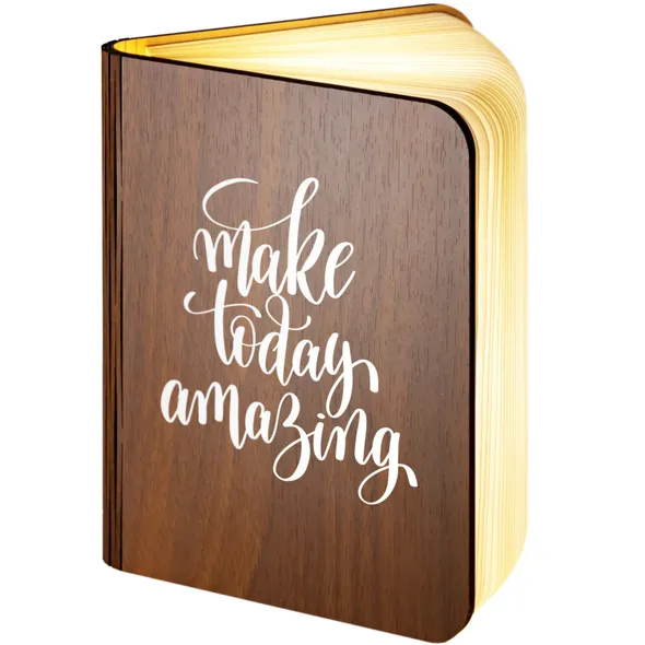Our wooden folding magnetic glowing LED book light is an ideal gift which makes a stunning gift for any recipient.It opens like a book, and the special hinge design allows you to change its shape according to your needs. Whether you are in the living room or your child is reading a bedtime story, book lights provide you with an elegant and fun lighting solution.Additionally, you can make this a unique gift with our great range of designs for the front and an additional personalised message on the back cover of the book. The outer cover is made from wood with a durable, waterproof, Dupont paper 'pages' expanding inner cover which diffuses and enhances the warm light from the multiple LED bulbs the instant you open the book.This is a really warm, comforting, remarkable gift which will literally make the recipients face light up.- Folding LED Book Lamp, can fold up to 360 degrees to create a mood / reading light- Magnetic covers for folding back onto itself or sticking to steel objects- Powered by internal battery. Re-chargeable with included USB cable from USB port / charger- Operating time 4-6 hours / Charging time 3-4 hours. Durable Waterproof Dupont Paper 'pages'- Make this a truly special gift by adding your own personal message on the book back