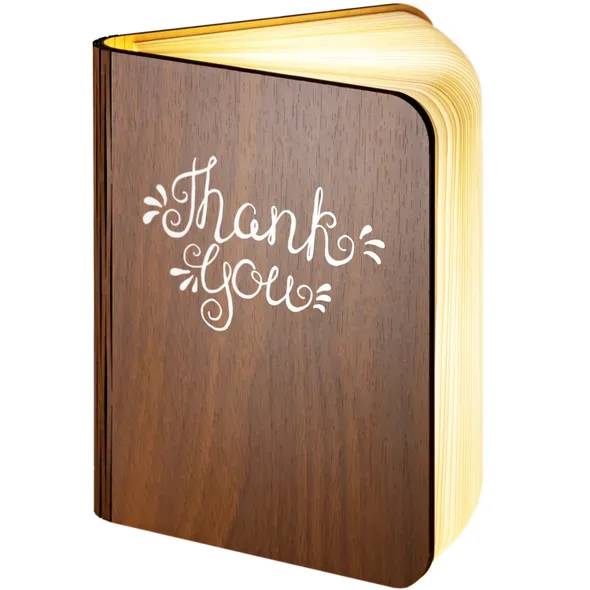 Our wooden folding magnetic glowing LED book light is an ideal gift which makes a stunning gift for any recipient.It opens like a book, and the special hinge design allows you to change its shape according to your needs. Whether you are in the living room or your child is reading a bedtime story, book lights provide you with an elegant and fun lighting solution.Additionally, you can make this a unique gift with our great range of designs for the front and an additional personalised message on the back cover of the book. The outer cover is made from wood with a durable, waterproof, Dupont paper 'pages' expanding inner cover which diffuses and enhances the warm light from the multiple LED bulbs the instant you open the book.This is a really warm, comforting, remarkable gift which will literally make the recipients face light up.- Folding LED Book Lamp, can fold up to 360 degrees to create a mood / reading light- Magnetic covers for folding back onto itself or sticking to steel objects- Powered by internal battery. Re-chargeable with included USB cable from USB port / charger- Operating time 4-6 hours / Charging time 3-4 hours. Durable Waterproof Dupont Paper 'pages'- Make this a truly special gift by adding your own personal message on the book back