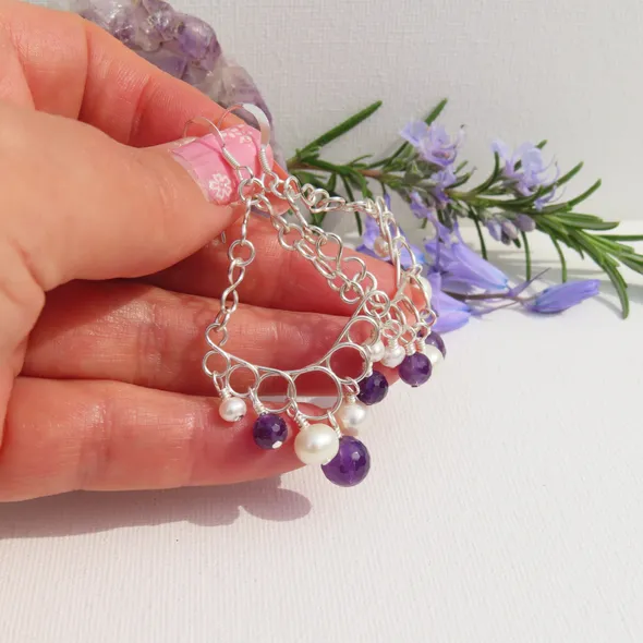 A handcrafted silver plated copper wire frame and chain has been created and suspended with 3.5mm & 6mm Cultured Freshwater Pearls and 5.5mm and 8mm Faceted Amethyst. They are just under 5.5cm long from the base of the Sterling Silver ear wire and around 3cm at their widest part. These are light and easy to wear and add a soft but substantial touch to your outfit.