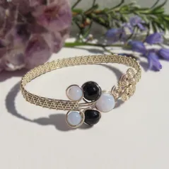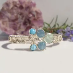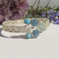 Double Fan Weave Cuff, Silver Plated Wire, Larimar, Faceted Kyanite & Faceted Aquamarine