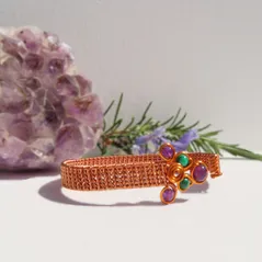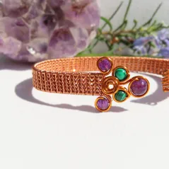 Copper Wire, Herringbone Weave Cuff with Amethyst and Malachite