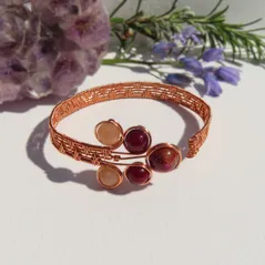 Double Fan Weave, Copper Wire Cuff, Faceted Sunstone, Faceted Garnet & Red Tiger Eye