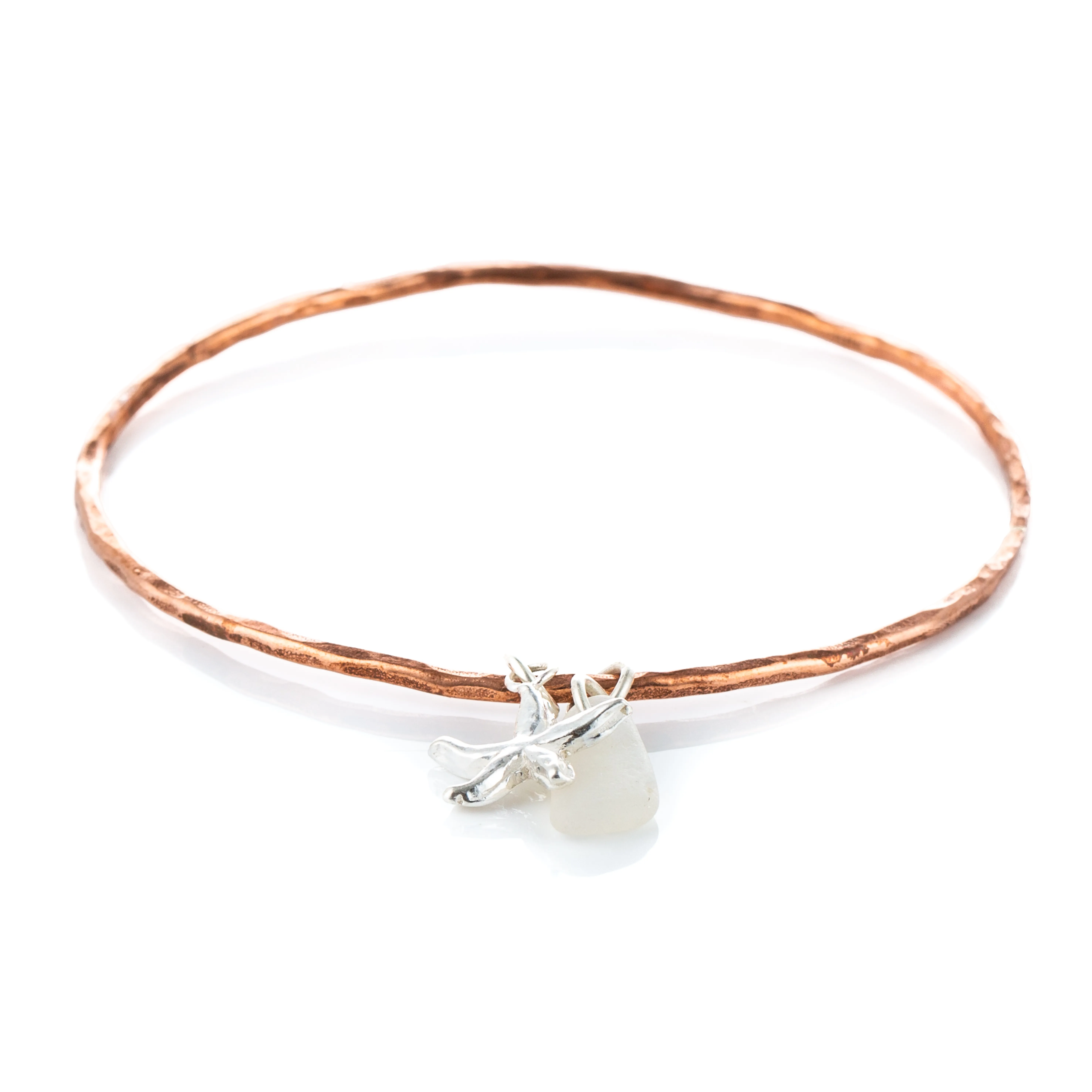 This beautiful bangle is lovingly handcrafted using copper. The bangle comes with a sea glass charm and a starfish charm that is made with fine silver. You may choose your silver charm, starfish or seashells. You can also choose the colour of sea glass to go on your bangle. You have the option to choose either a textured or smooth finish for your bangle, depending on which look you like best. Or you could have one of each!
