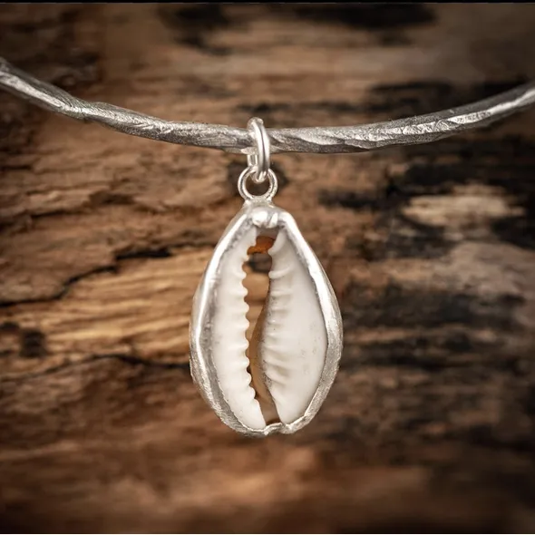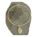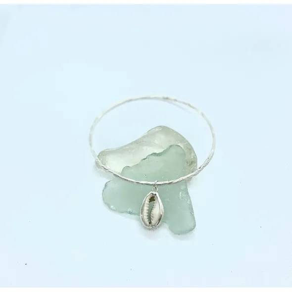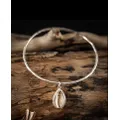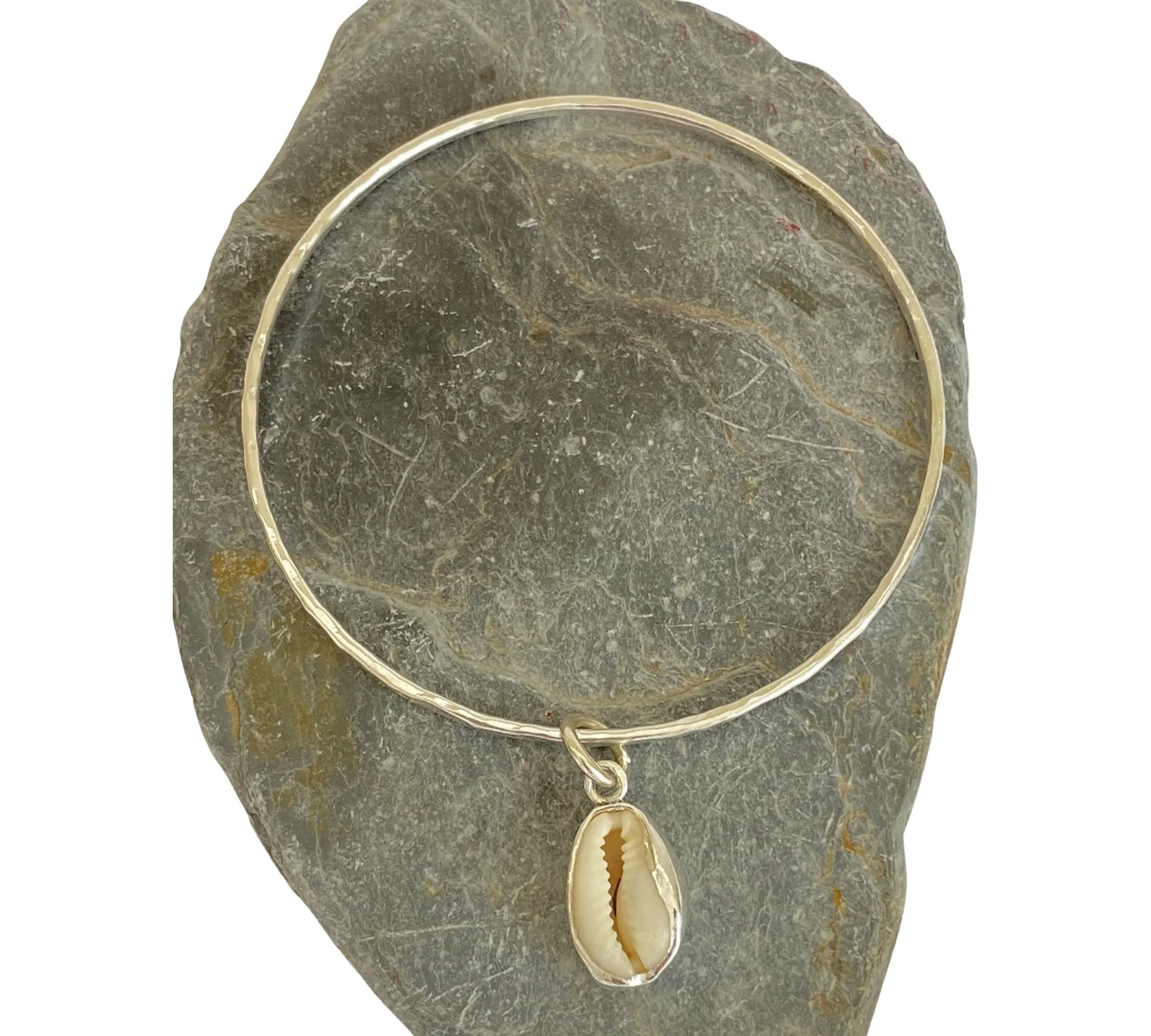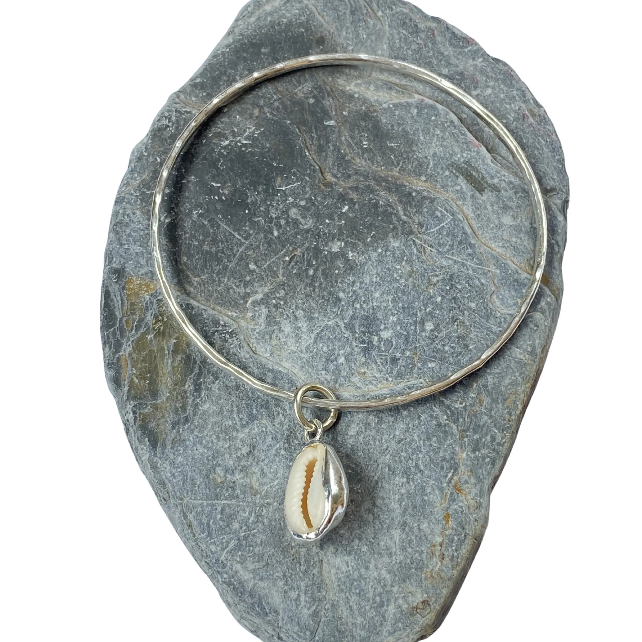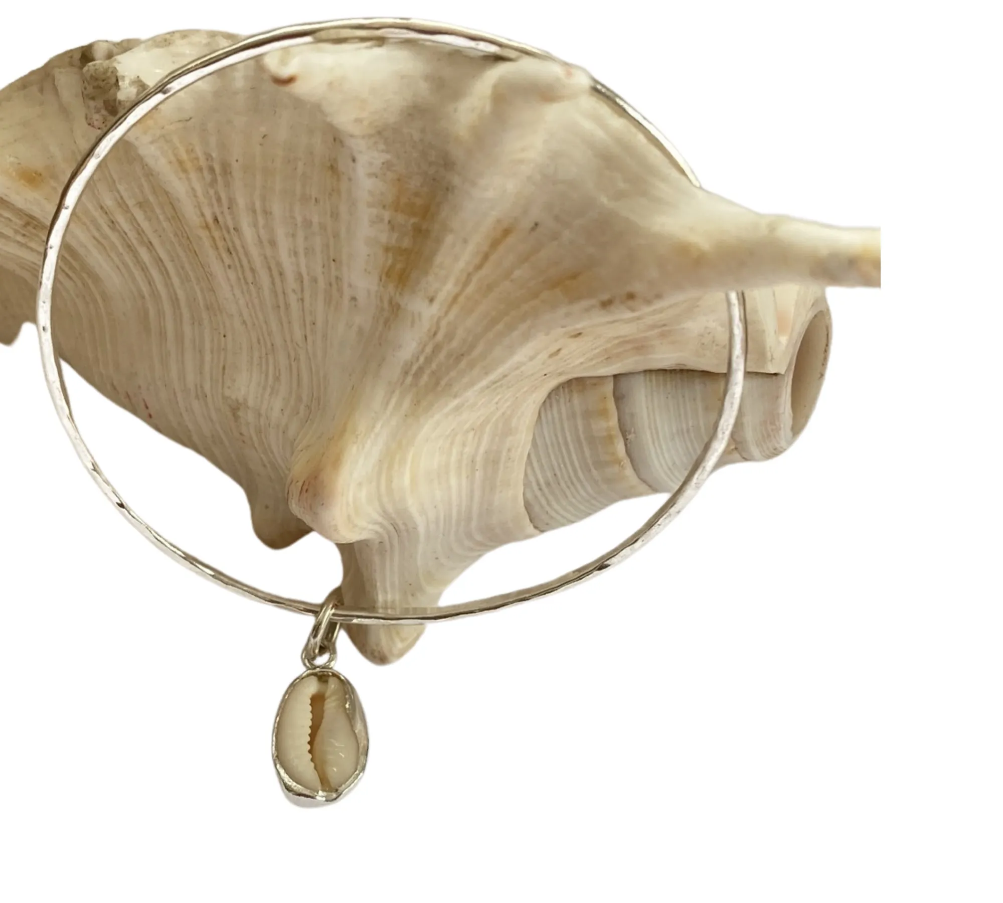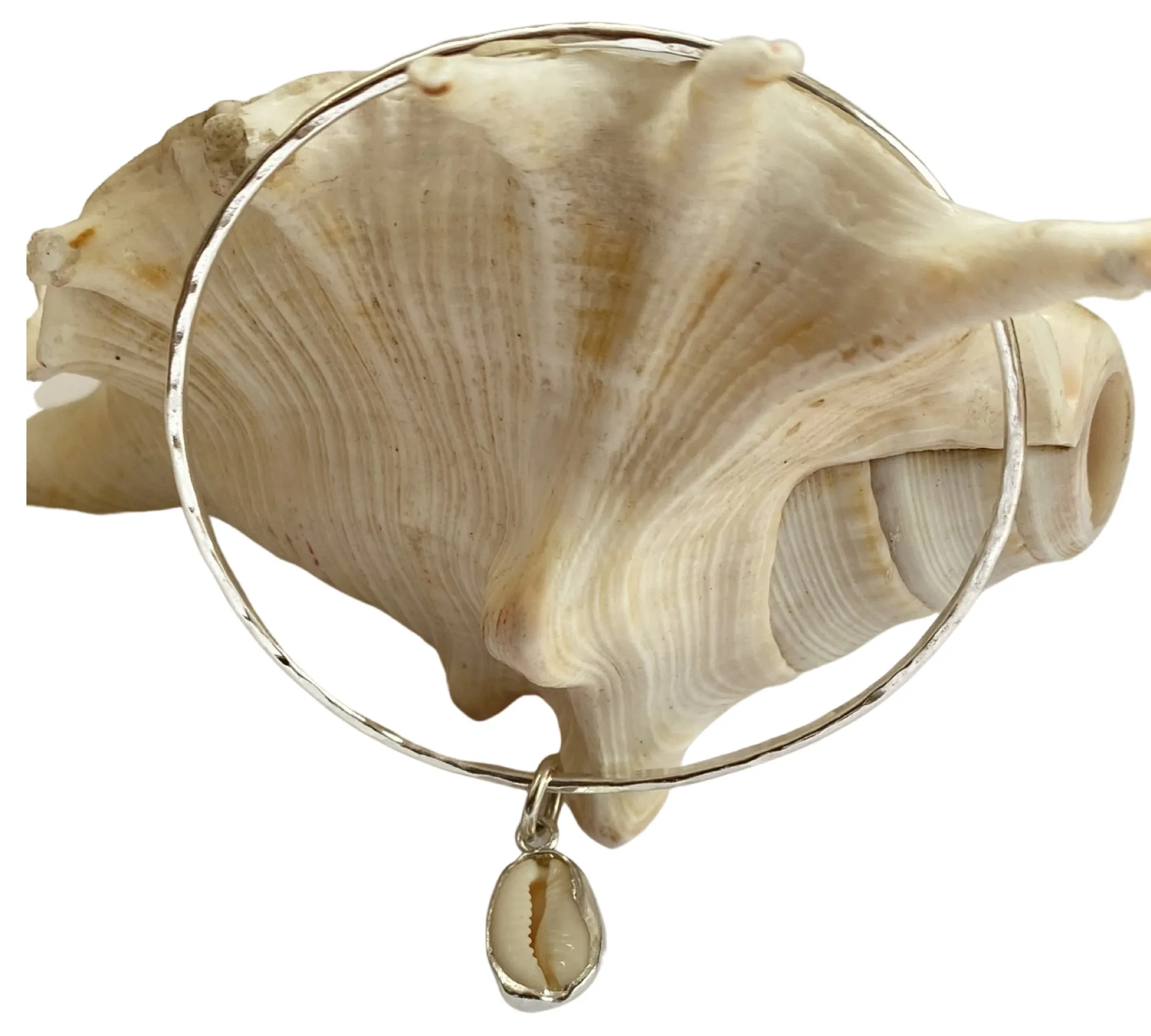 solid sterling silver Bangle with cowrie shell charm framed with fine silver