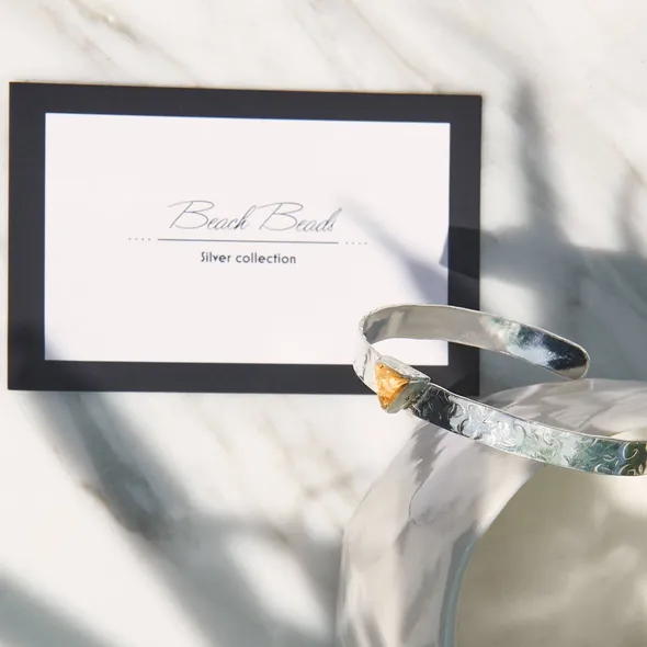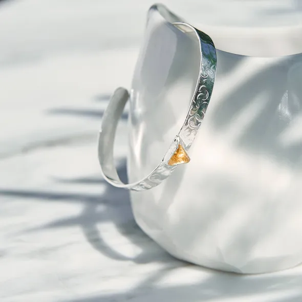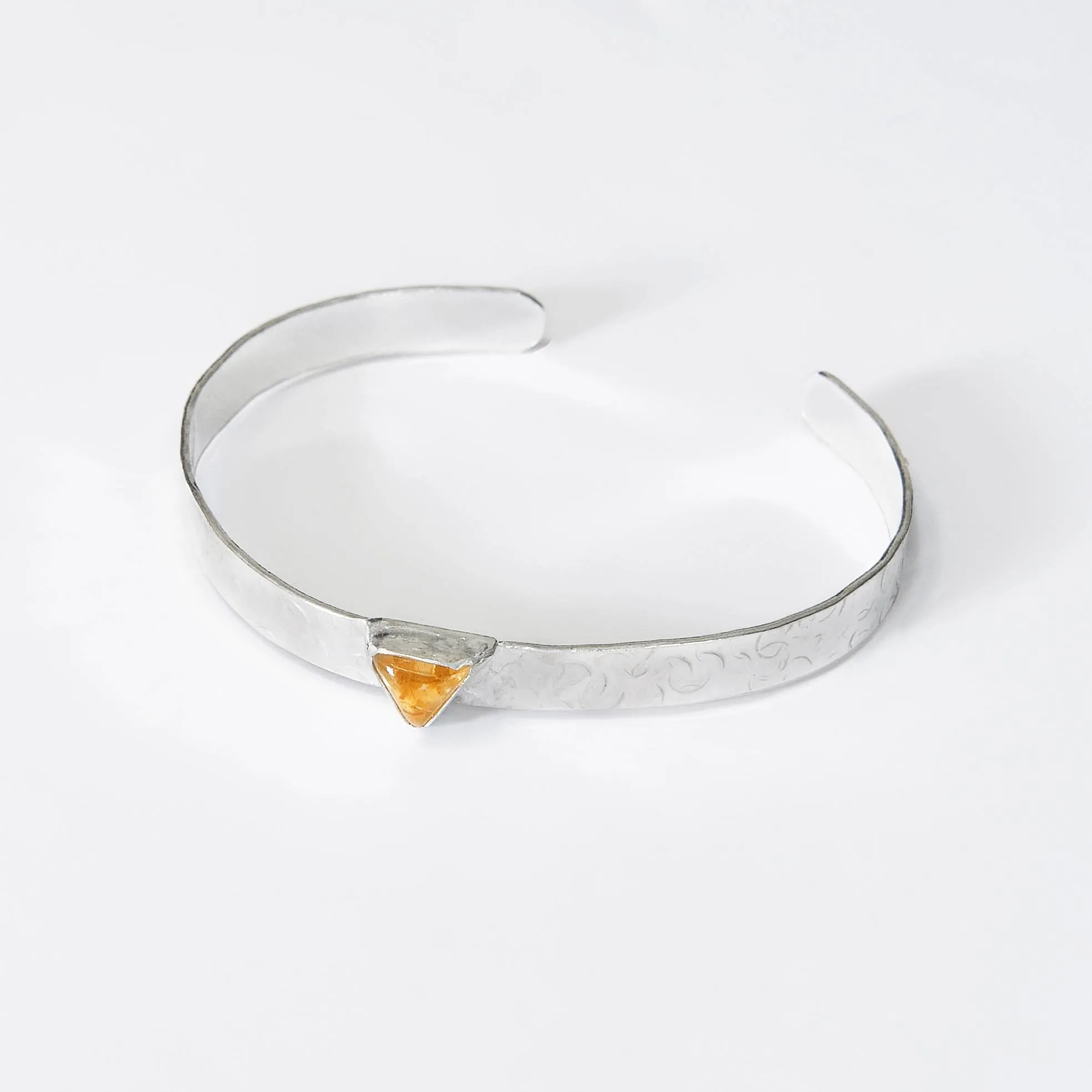 I have set the gemstone in a silver setting.. The bracelet sterling silver 4mm wide. and is able to be molded slightly for fit. I have hammered a pattern onto the bangle. This cuff bracelet is a small -medium size