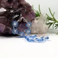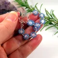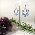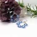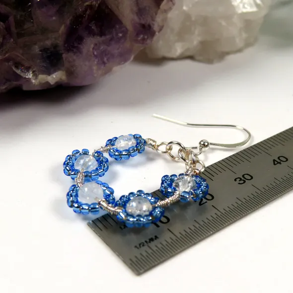 A very pretty and delicate pair of earrings handcrafted using Clear Crackled Quartz and Miyuki seed beads to form a hoop of flowers. Using a silver plated copper wire, 5 flowers have been created and formed into the ever popular hoop design. The Clear Crackled Quartz has been surrounded with "petals" of Miyuki seed beads in silver lined Cornflower Blue which compliment the Haematite.