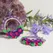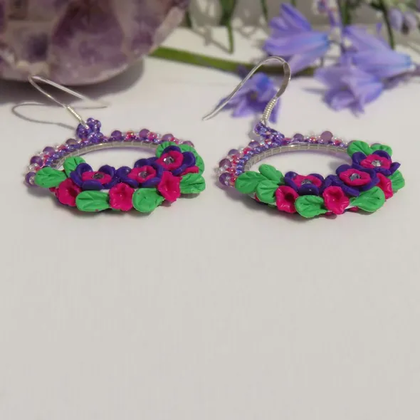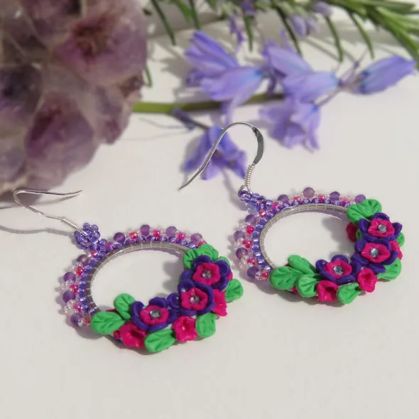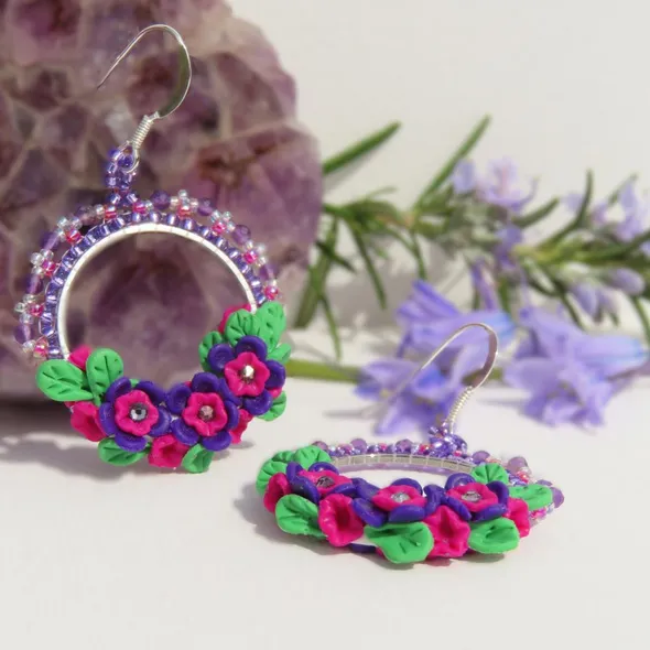 A one off design by Fiona of Fifi and the Peacock. A delicate polymer clay bouquet, with a glimmer of glass crystals has been placed around the bottom of a silver coloured hoop. Around the top of the hoop, Miyuki Seed beads have been added and embellished with 3mm micro faceted genuine Amethyst gemstones. Set on sterling silver ear wires, these measure approximately 4.1cm from the base of the ear wire and are around 3.5cm wide.