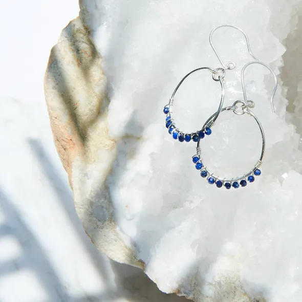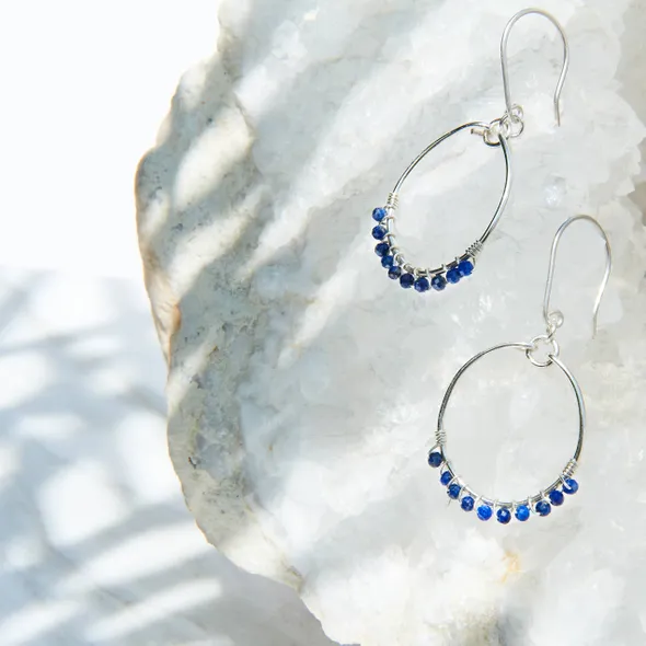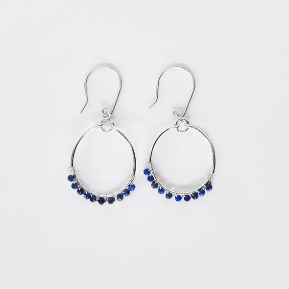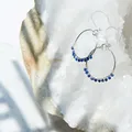 A beautiful one of a kind pair of Hoop earrings. Hand wire wrapped with 3mm midnight blue Lapis faceted round gemstones Deep midnight blue colour. These stones sparkle like the stars. Such a gorgeously comfortable pair of Sterling Silver hoop earrings, which will see you through your all seasons wardrobe and will look fabulous with your day to evening wear. The beautiful, dark bue gemstones look striking against the contrast of the Sterling Silver wire and hoops. Perfect to wear with a shirt and jeans through to an evening gown; so versatile! ???? I have hand wire wrapped 3mm gemstone beads onto Sterling Silver wire and created hoop earrings. The earrings drop 4cm and the hoop 2.5 cm. If you have any questions, please don’t hesitate to drop me a message. If you have a preference of stone colour I can customise to your preference.