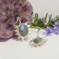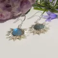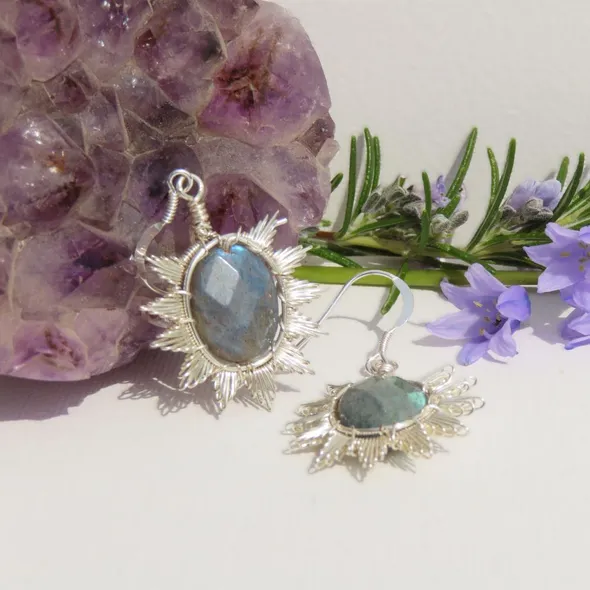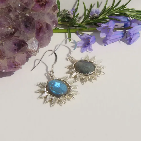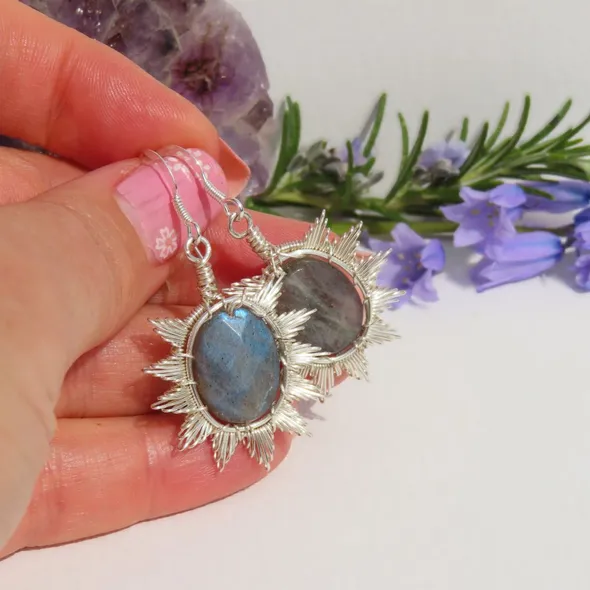 The faceted Labradorite ovals measure around 14mm x 10.52mm and have been set into a wirework, handcrafted, sunburst design. The earrings are approximately 3.5cm from the base of the Sterling Silver ear wires, they are 2.6cm at their widest point.