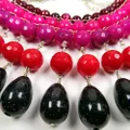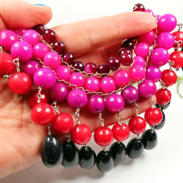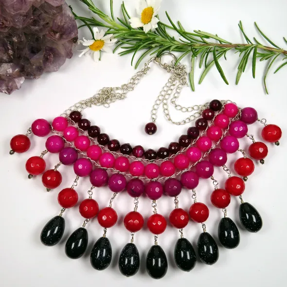 Bright and bold statement collar style necklace.A piece of jewellery that will add the "wow" factor to your outfit.I think this is a piece that is definitely in the "Marmite" category, you'll either love it or you won't. It's certainly not a piece for the shy retiring type and one aimed at the big and bold type. This collar style necklace is a statement piece on its own and will take centre stage when you wear it. It has been made with the idea that you want to make an entrance to the event you choose to wear it at, although it does look good with a pair of jeans and a "nice" top - you know the tops I mean! This is a substantial necklace, very gem heavy, and actually weighs in at 153g.Semi Opaque Red Agate faceted round beads = 8mm