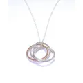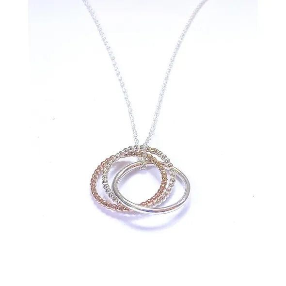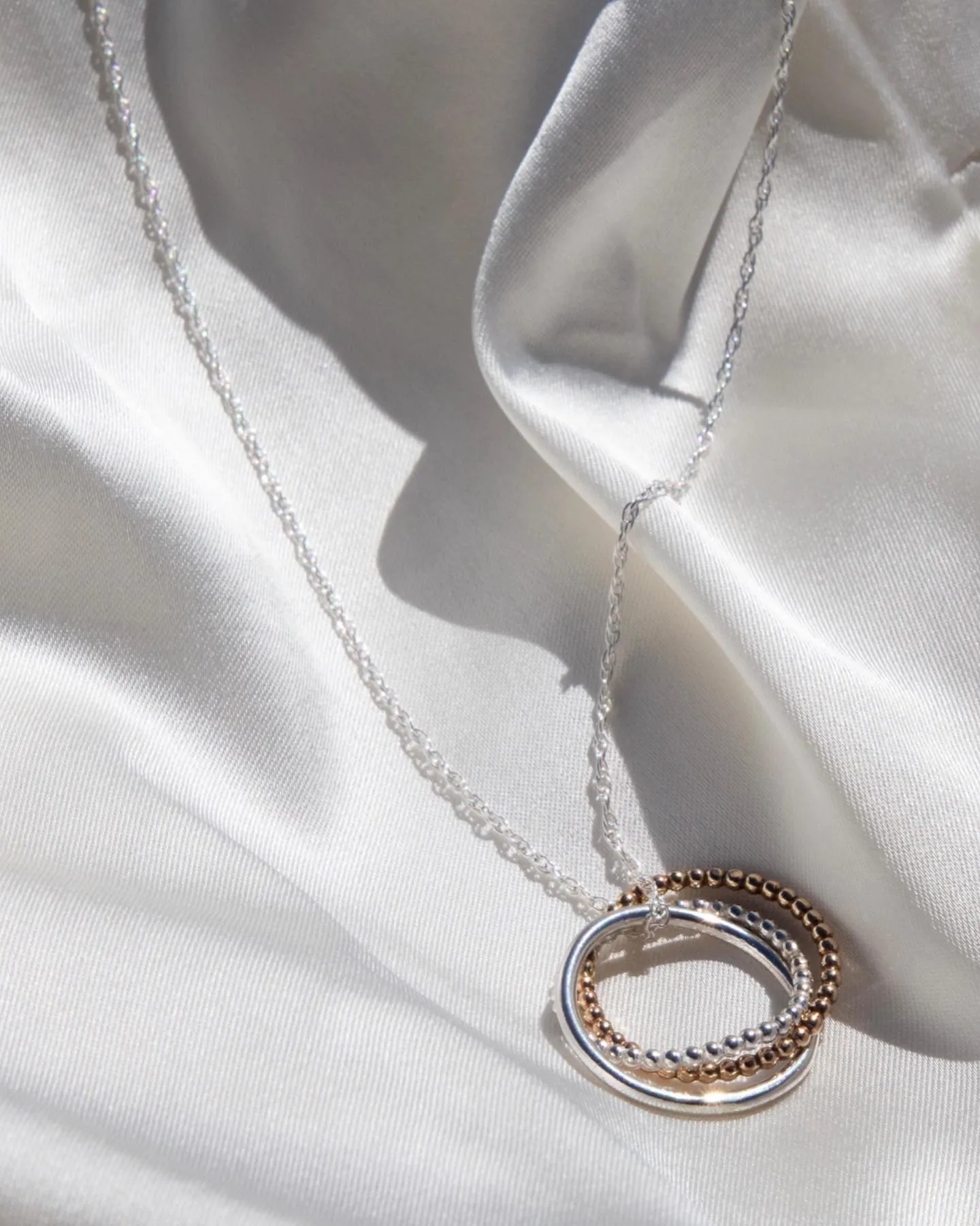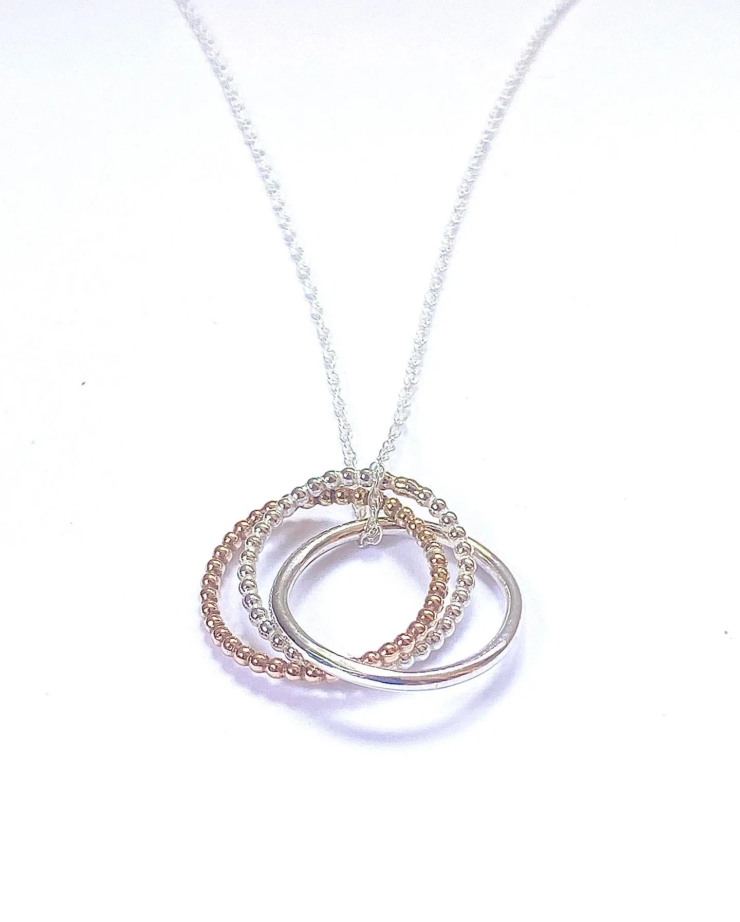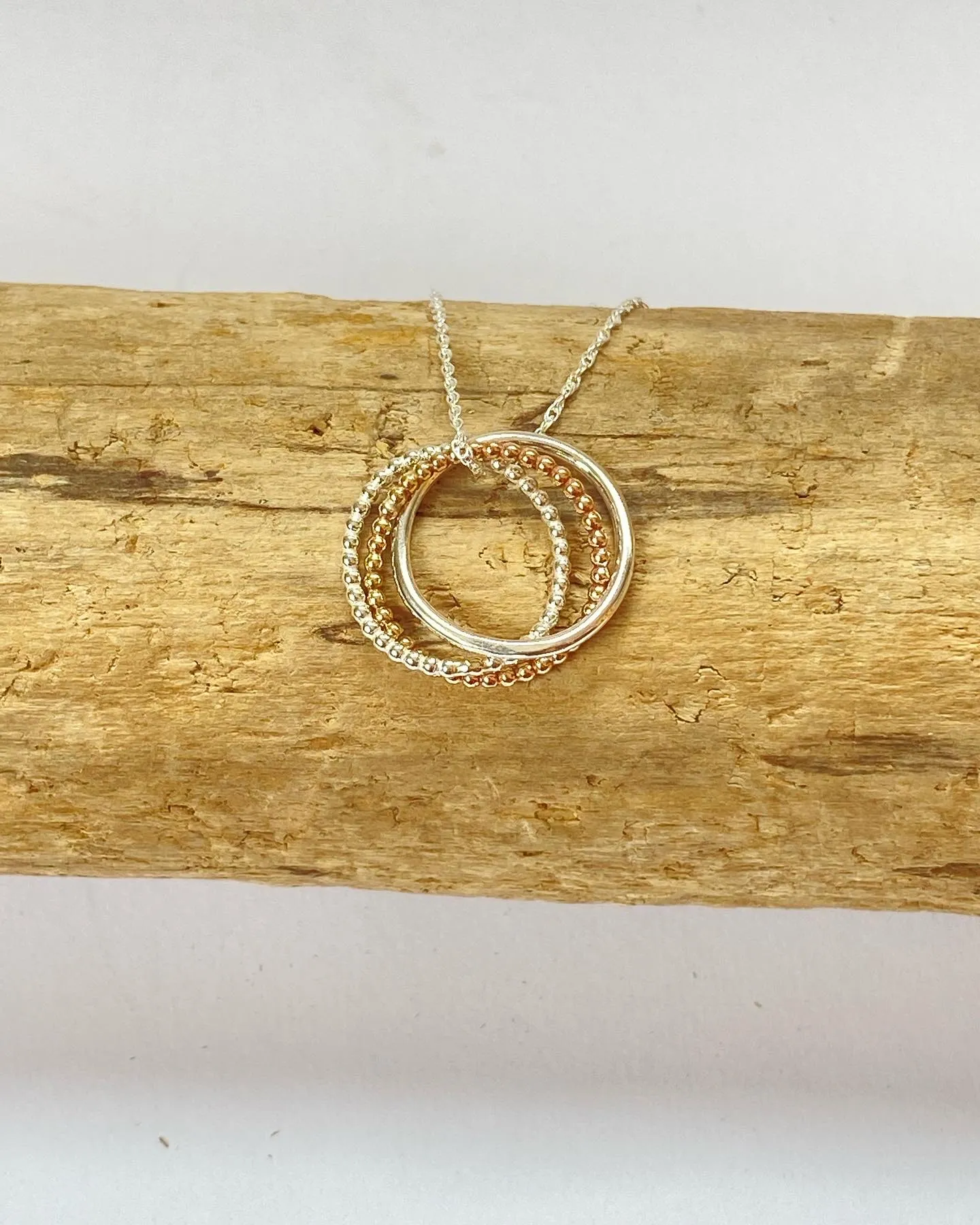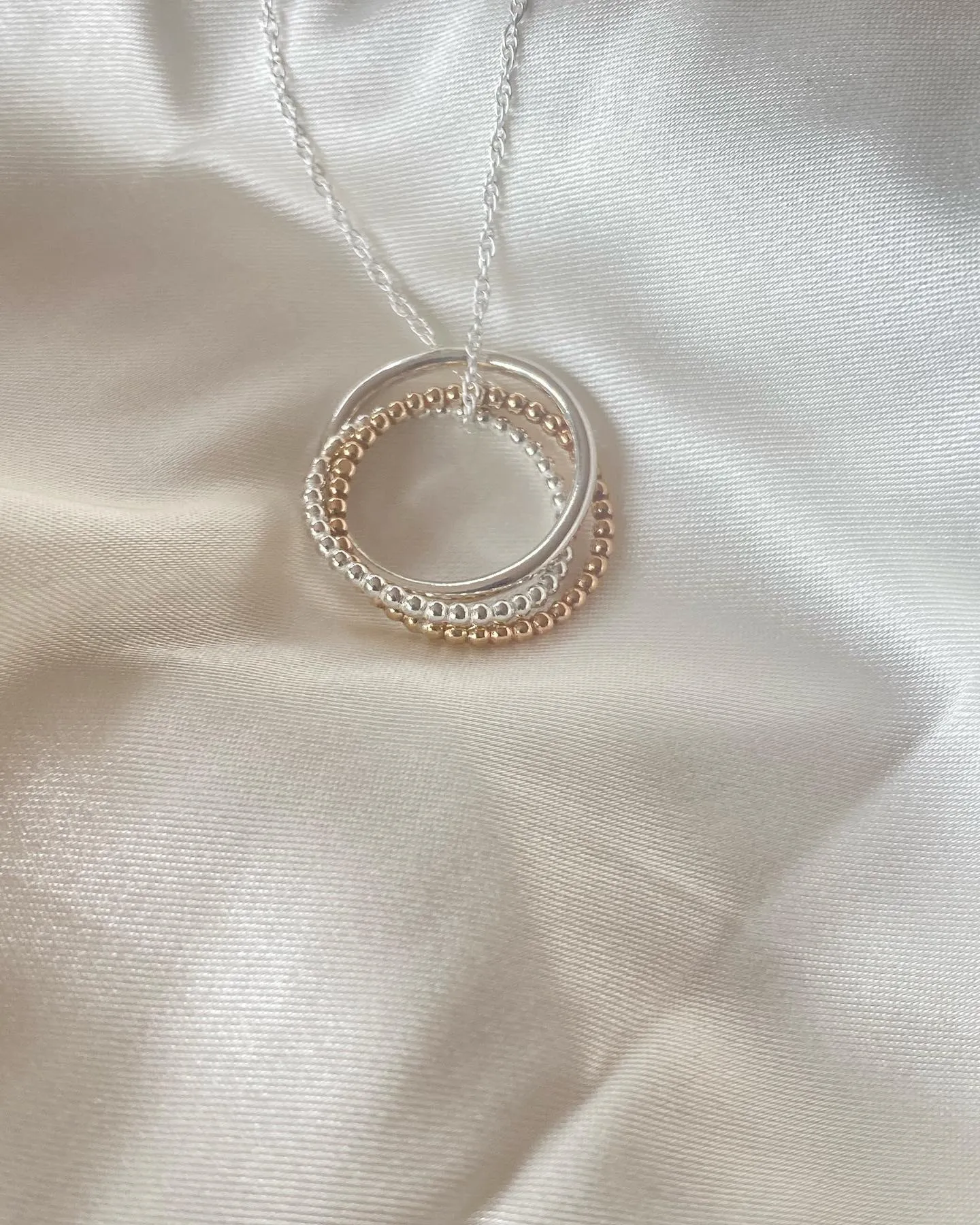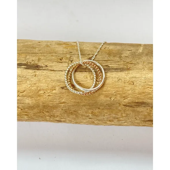This stunning sterling silver and gold filled ring necklace features a trio of interlinked and free-moving rings. The rings/circles symbolise wholeness, strength, unity and everlasting eternal love. Three rings interlinking which portrays a classic but balanced with a classy modern look. They come suspended on a sterling silver chain 40 or 45cm. If purchasing for a special occasion such as a birthday or anniversary each ring could be seen as representing a decade, therefore with 'three rings for three decades' this gorgeous handmade necklace would make an ideal 30 birthday gift or 30th anniversary present for her. Each ring also represents eternal love love making it the perfect gift for a friend or loved one.
